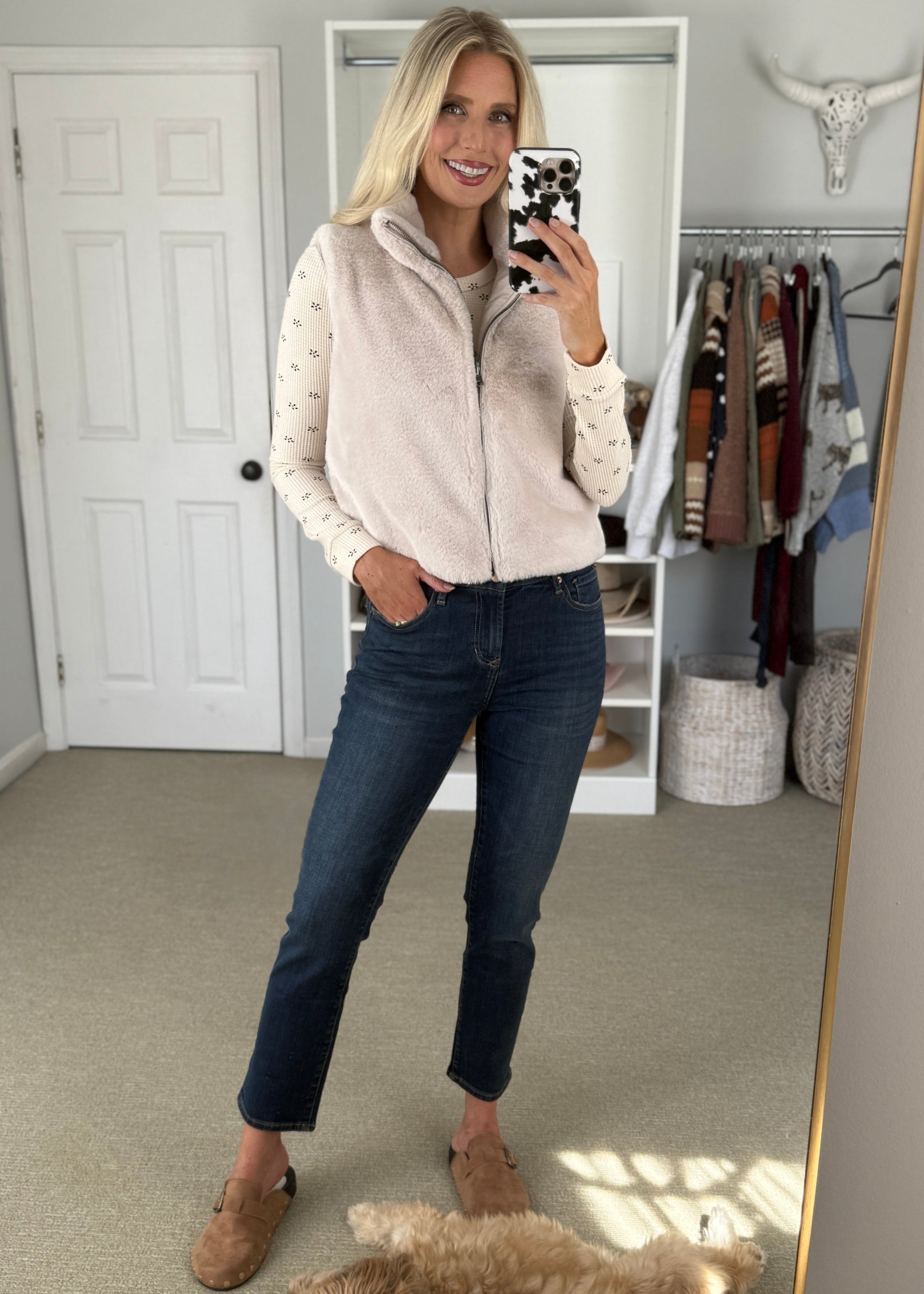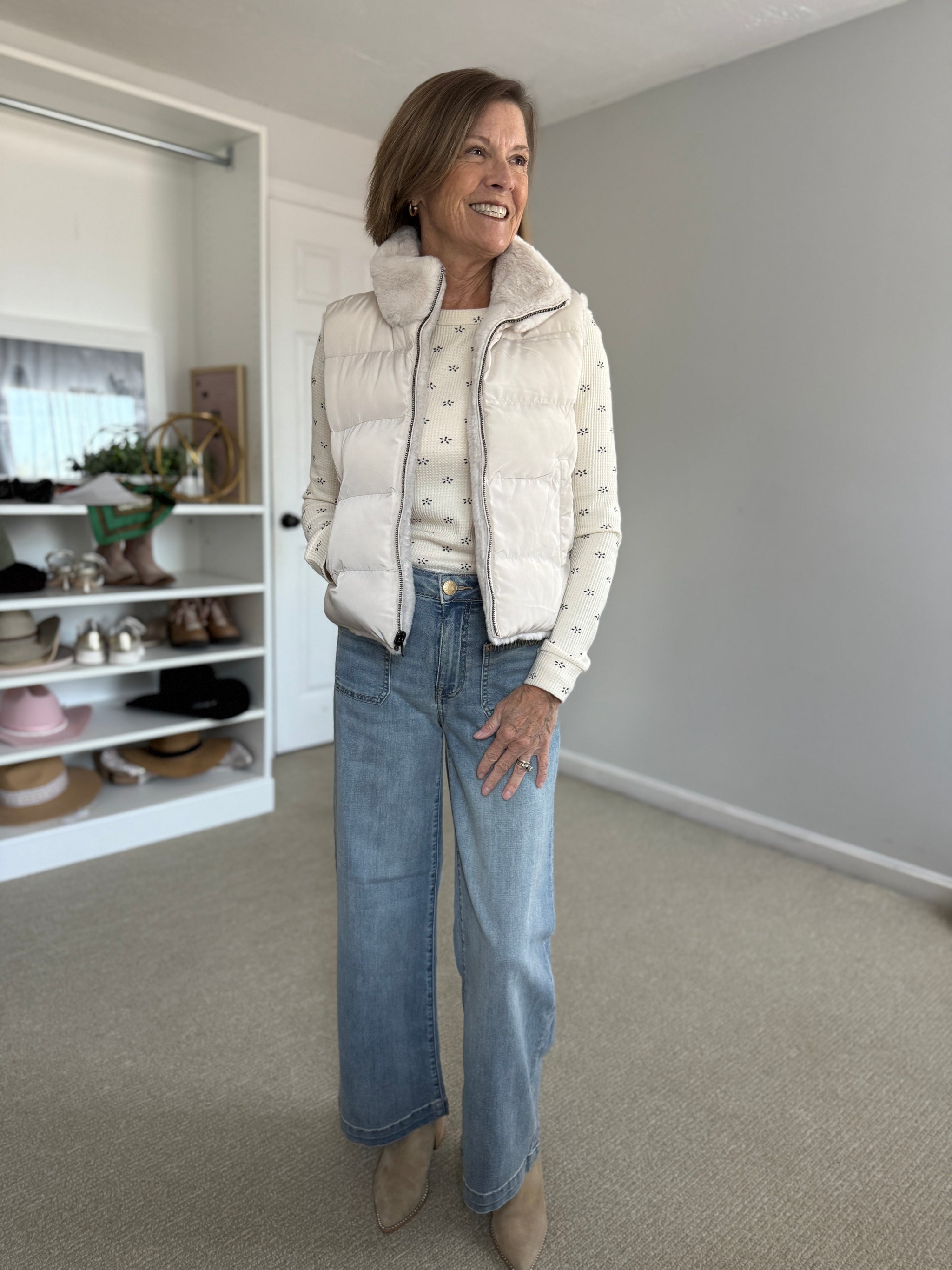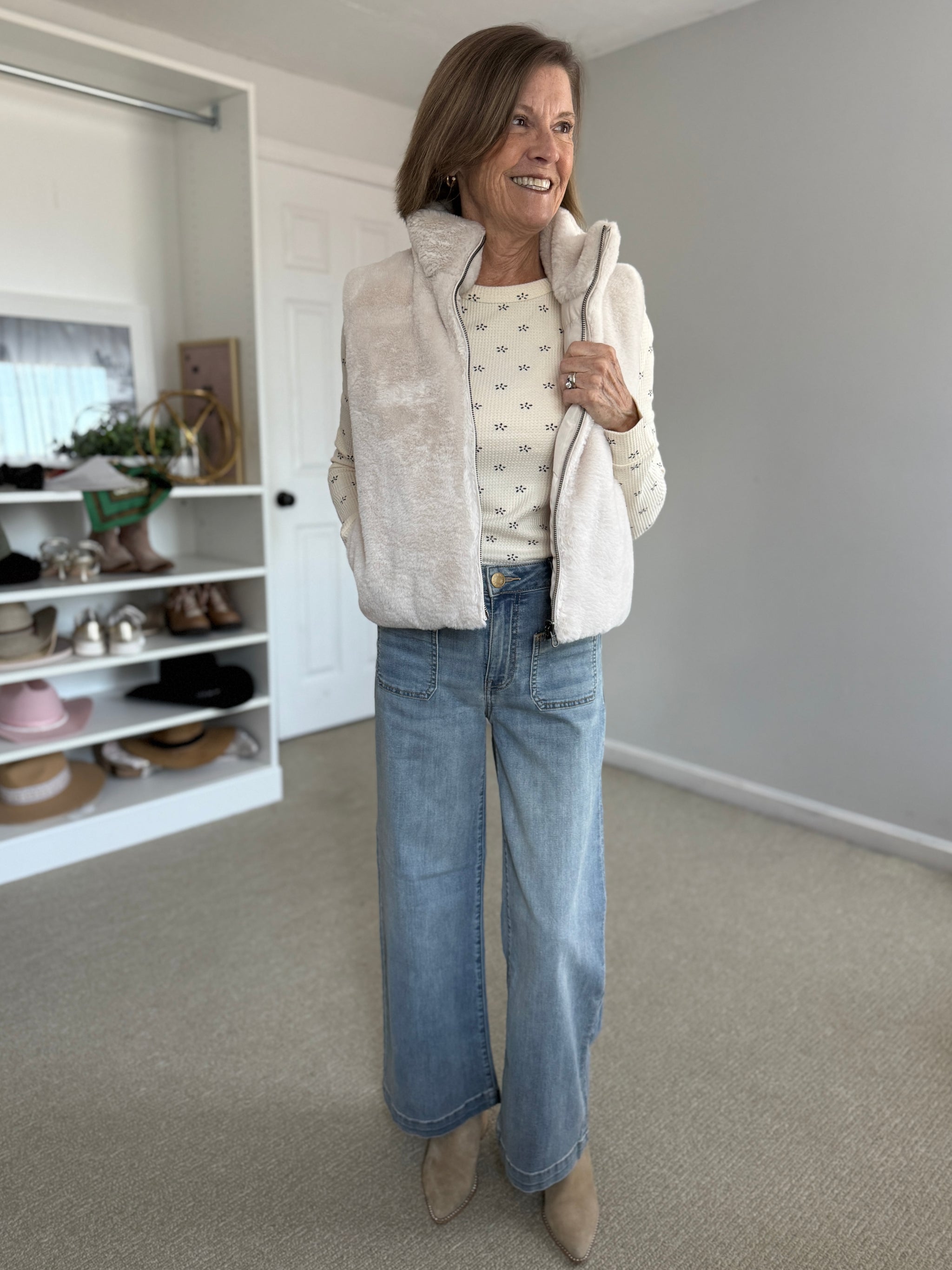 Explore the great outdoors (or just hit the brewery!) wearing this classic vest in Faux lambs' wool in cream. Trimmed in a quilted poly deep...