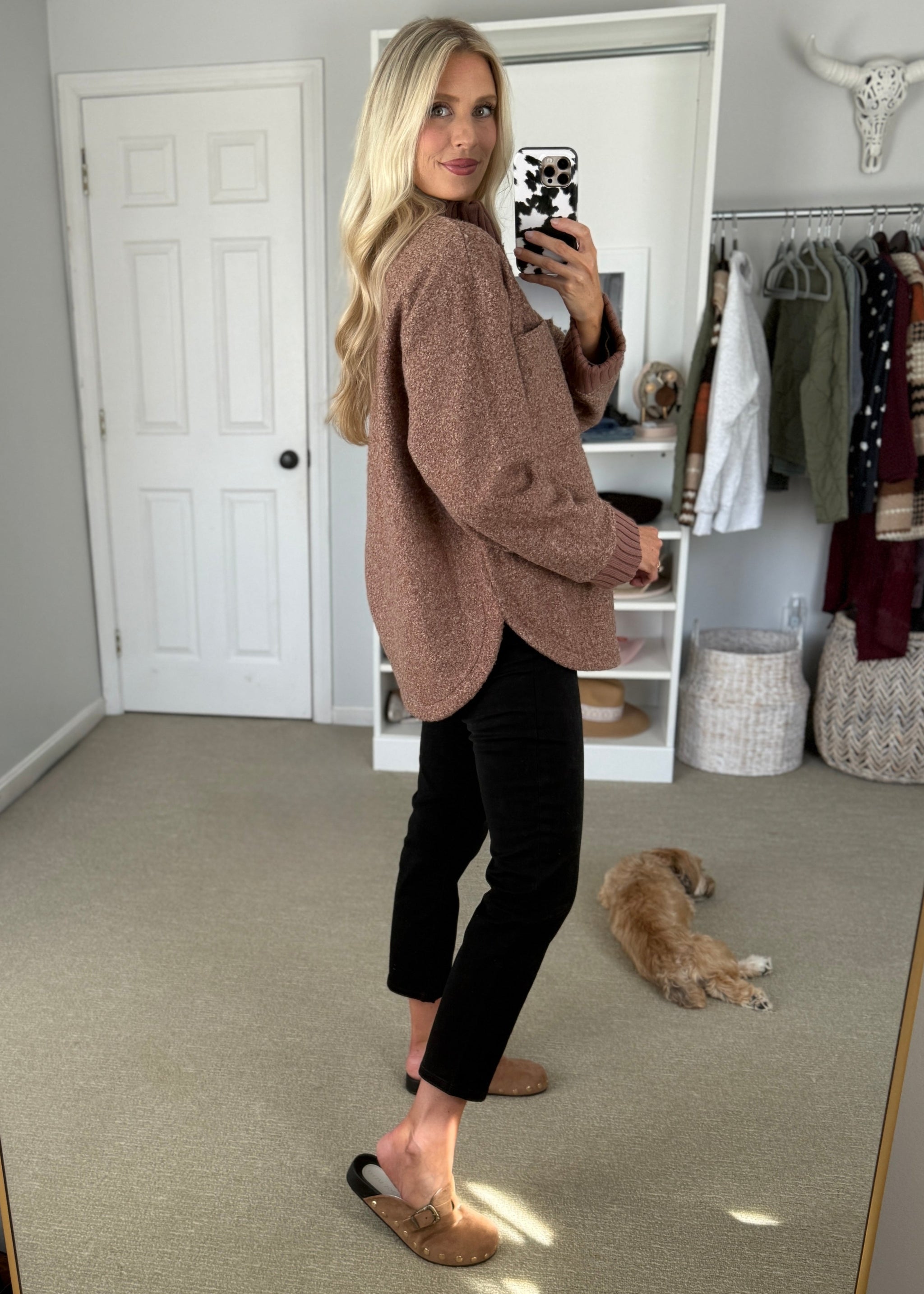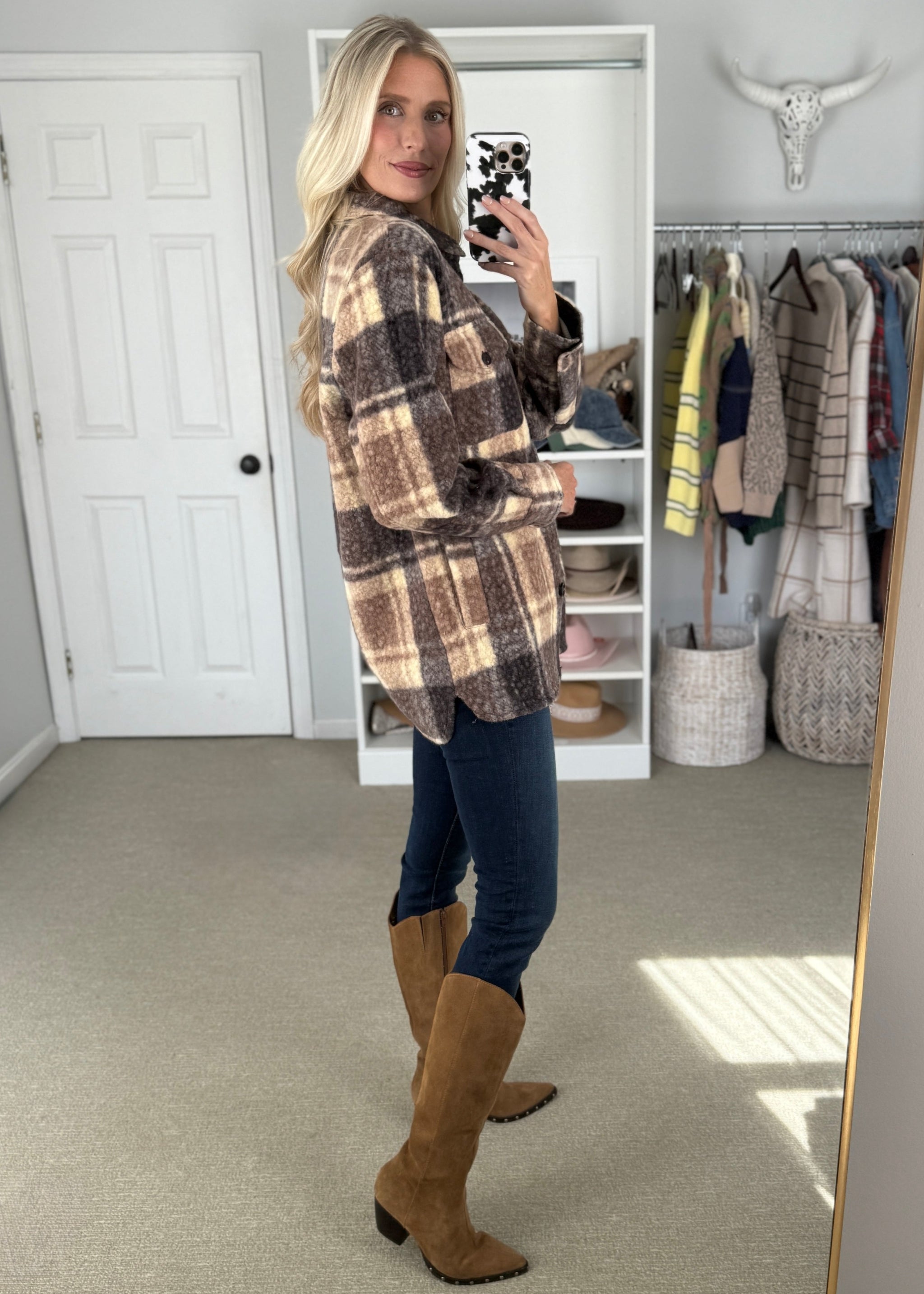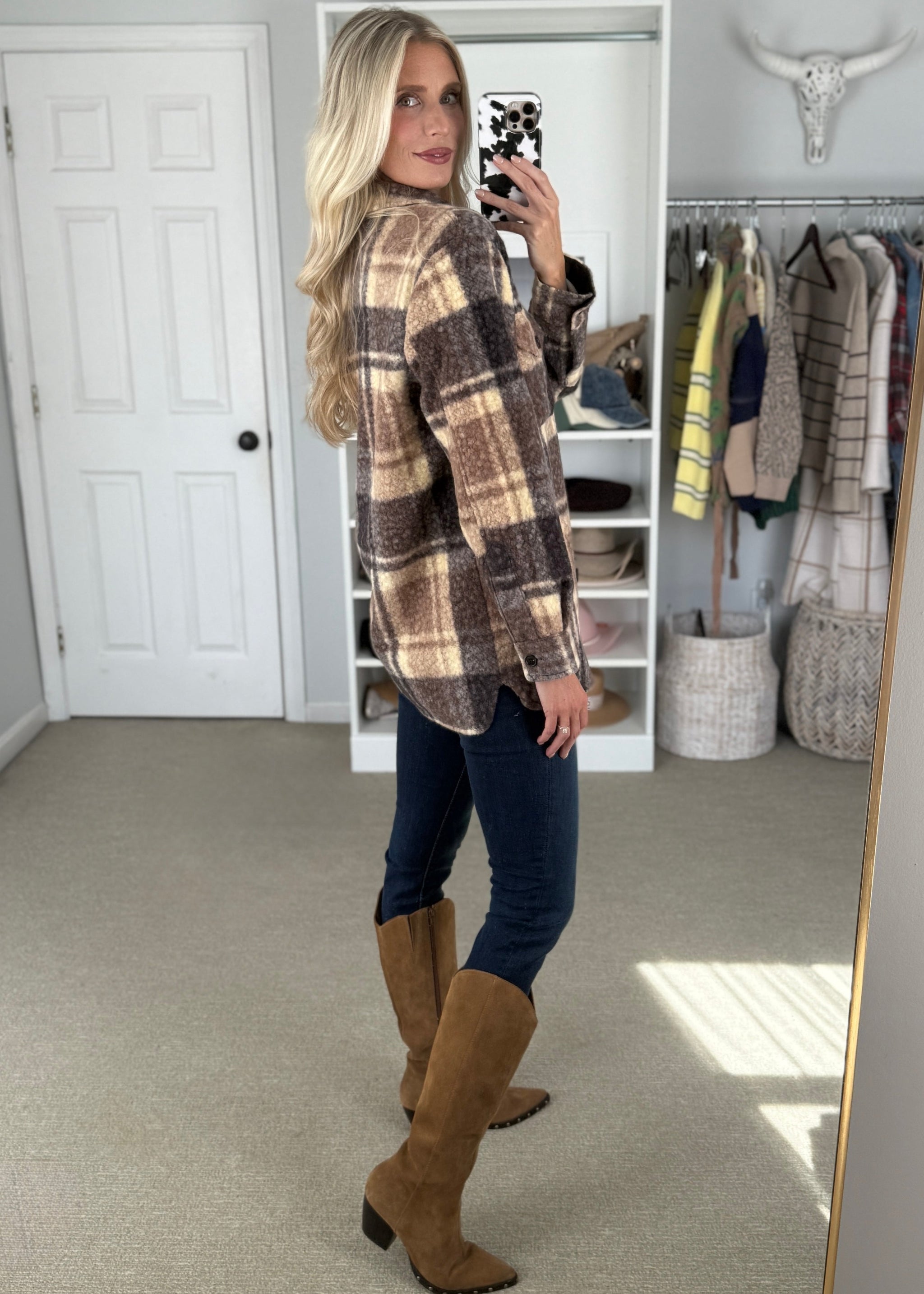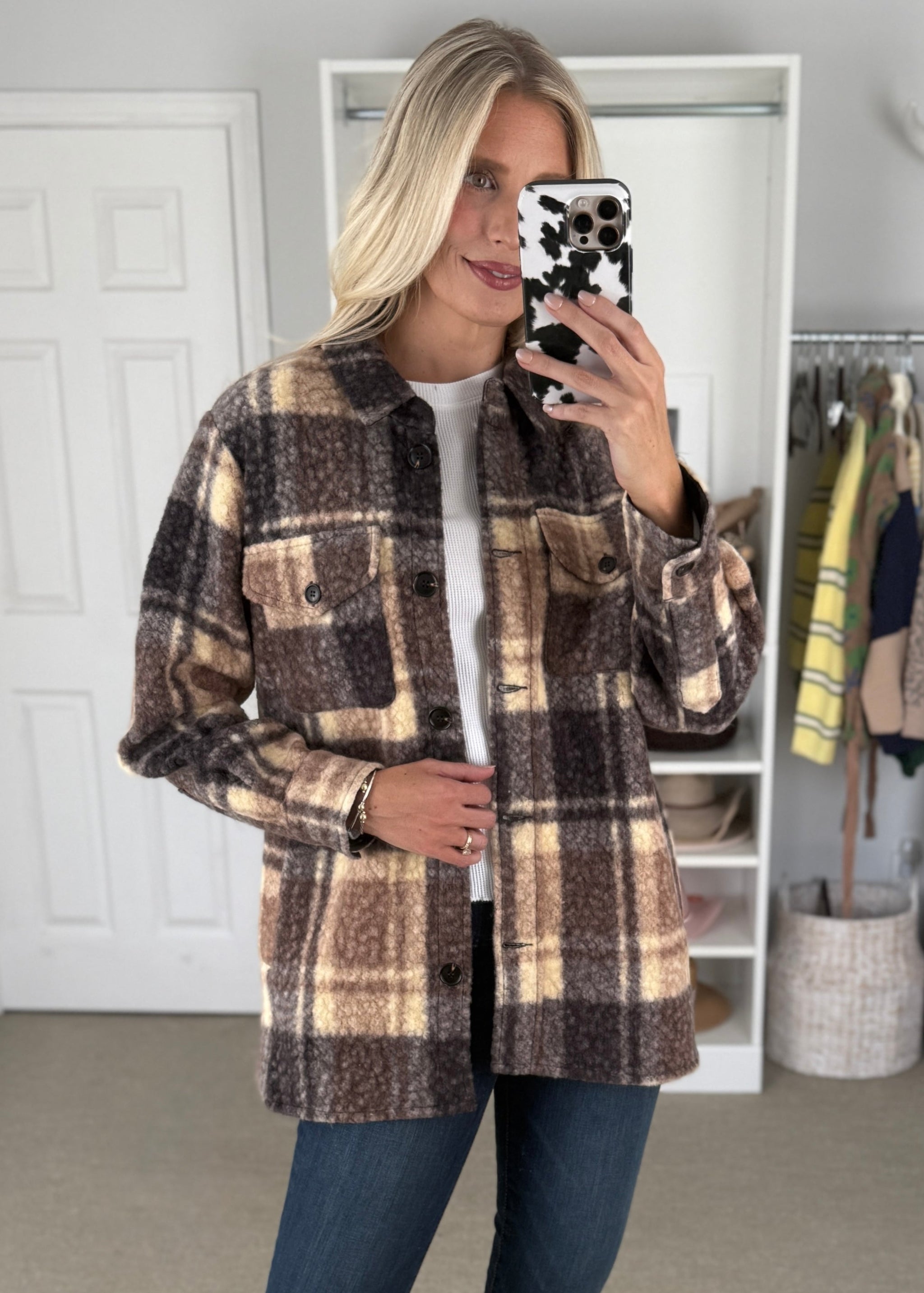BUTTON FRONT LONG SLEEVE RELAXED Fit shacket. Unlined. Oversized fit is true to size.