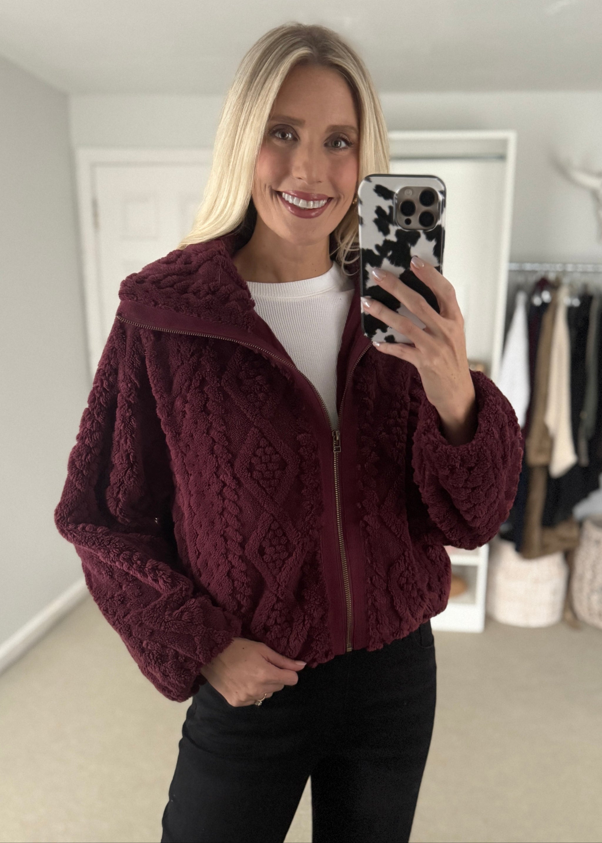 This luxurious cable stitch patterned jacket is a rich wine color you'll love to wear all fall and into winter. It features a sturdy zipper,...