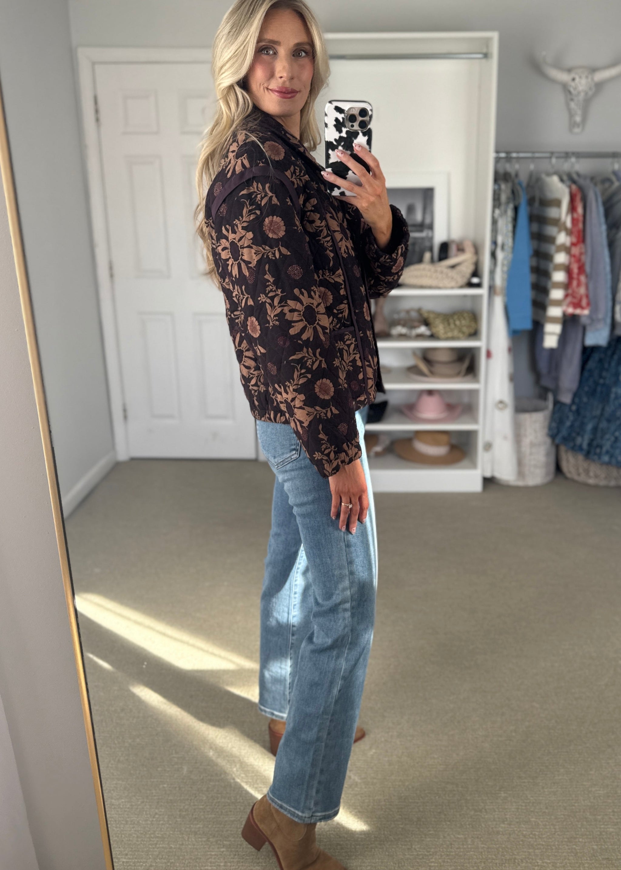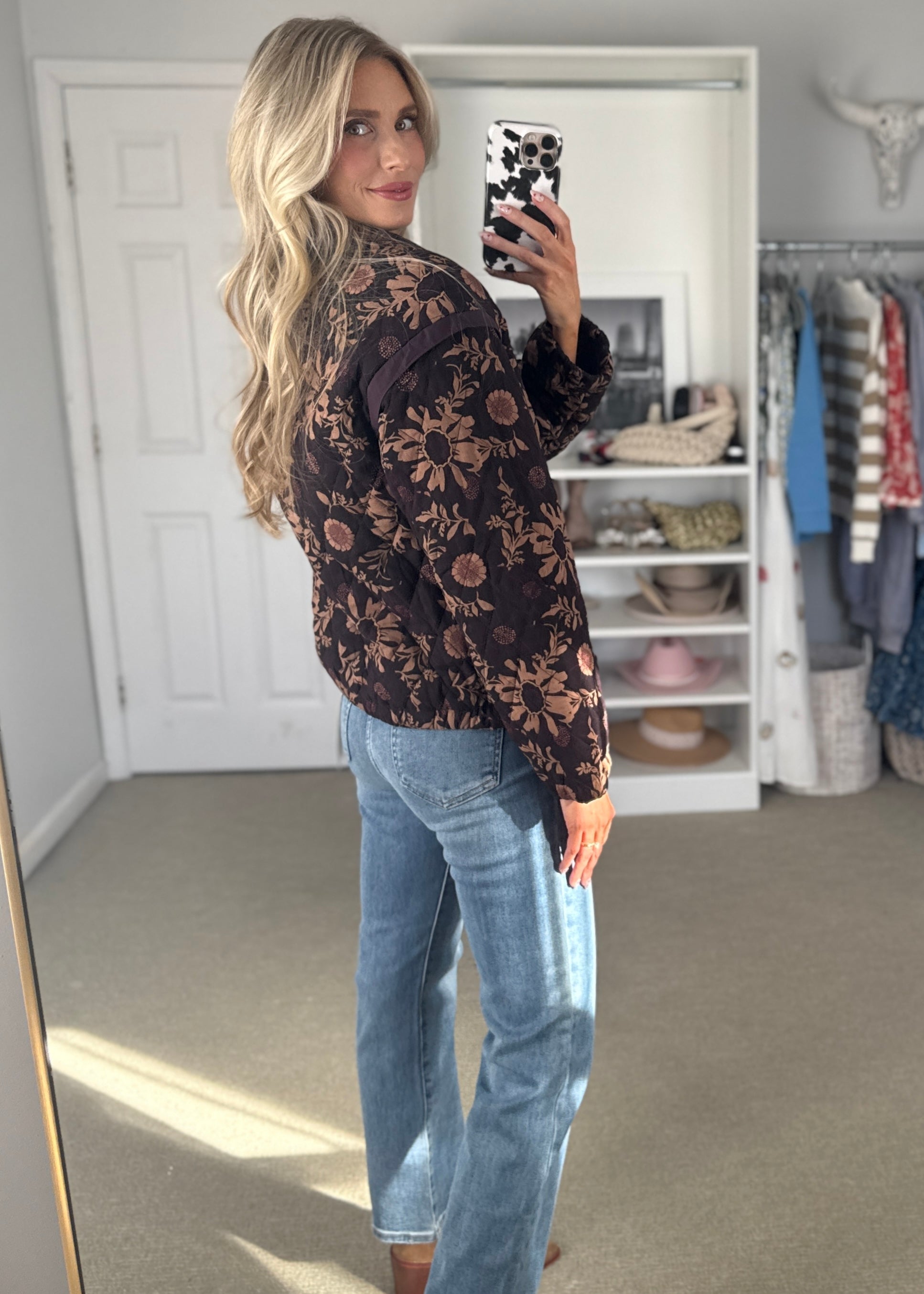 Wrap yourself in cozy, bohemian charm with this quilted floral jacket. Crafted from a soft, lightly padded fabric in earthy, vintage-inspired tones, its shawl collar...