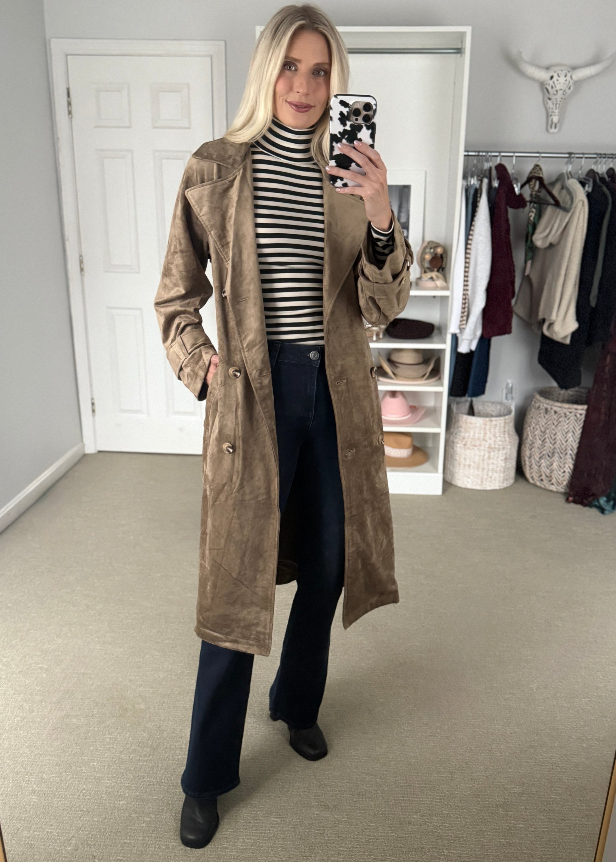This midweight trench is all about quiet polish. Made from soft faux suede with welt pockets and a tie waist, it layers beautifully while keeping...