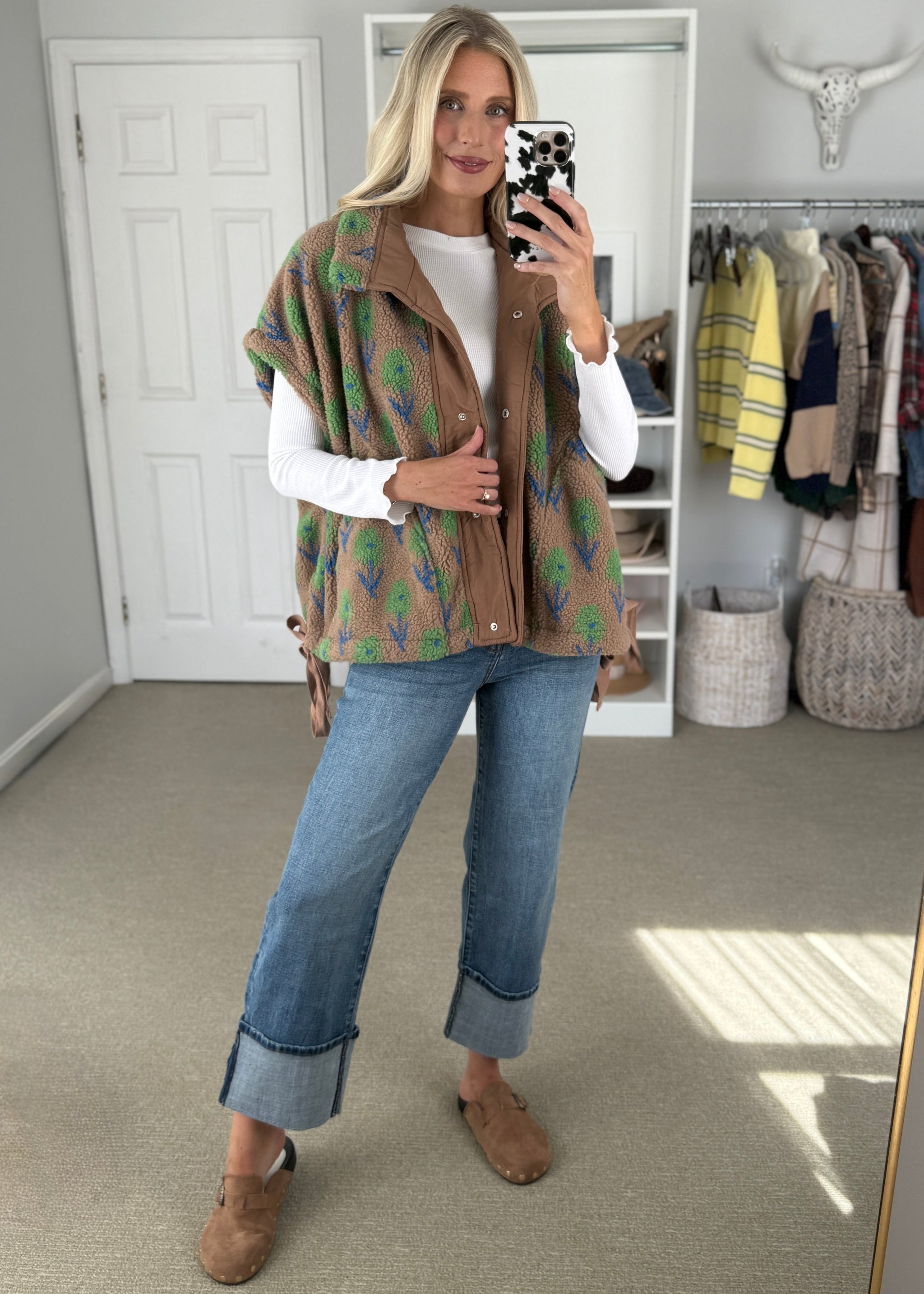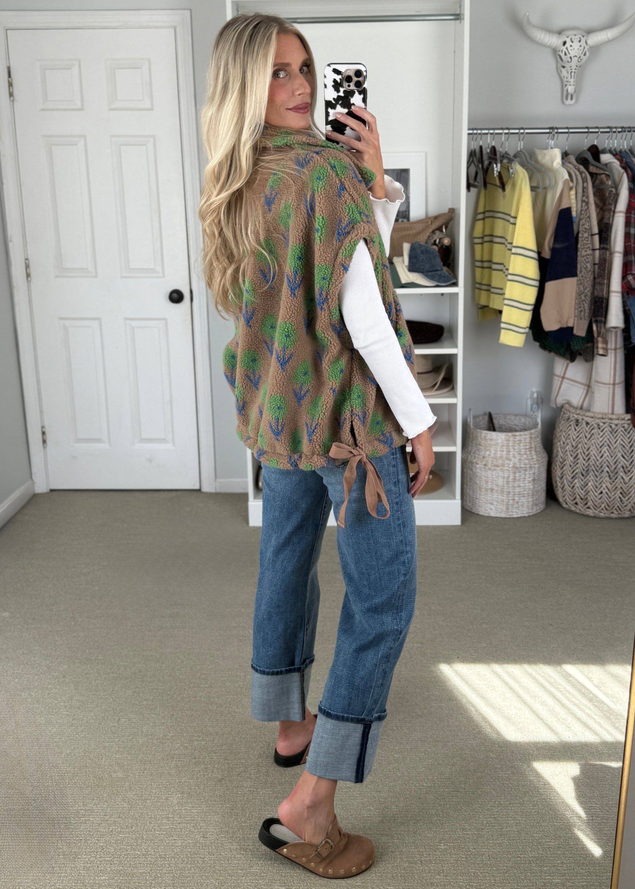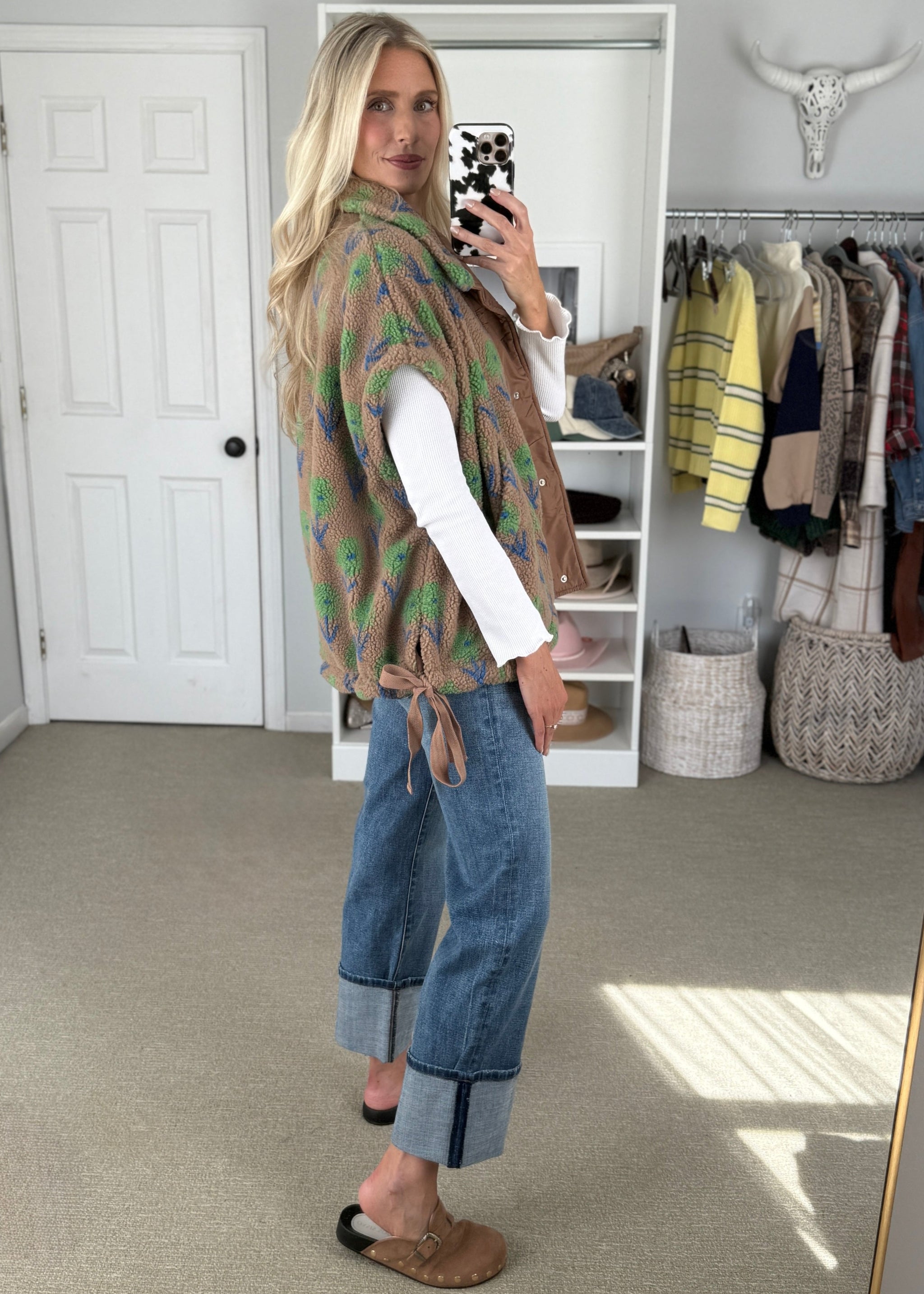 We love this scalloped hem vest in a quilted leaf pattern. It has a highcollar and contrasting trim with snap closure and slanted slit pockets...