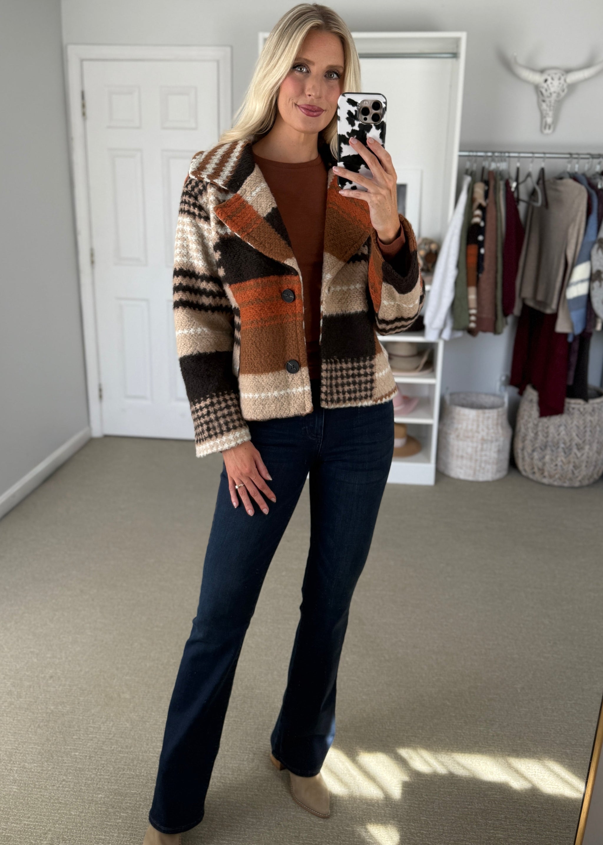 The ultimate fall jacket made in a cozy felted fabric that feels fantastic! It has a satiny lining, front slash pockets, oversized buttons and lapels....