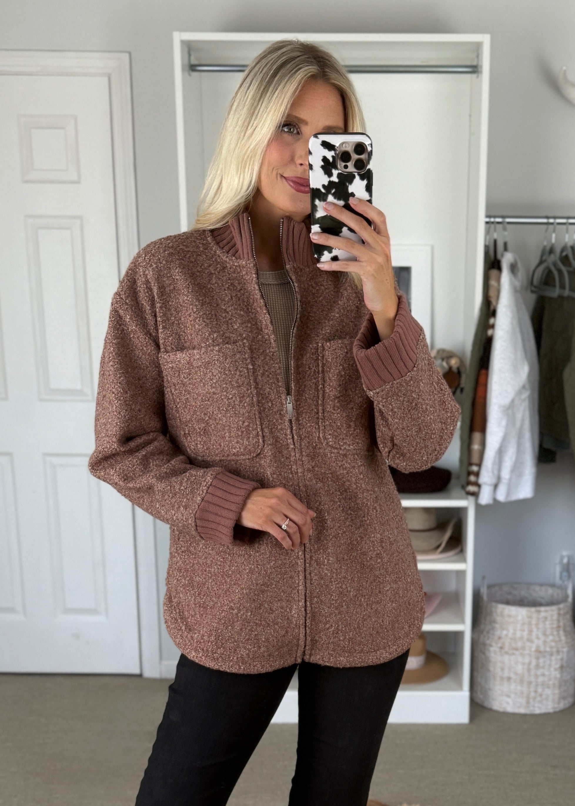 This jacket is just scrumptious! Made in a warm heather brown, it's trimmed with thickly ribbed cuffs and turtleneck. Two large patch pockets and a...