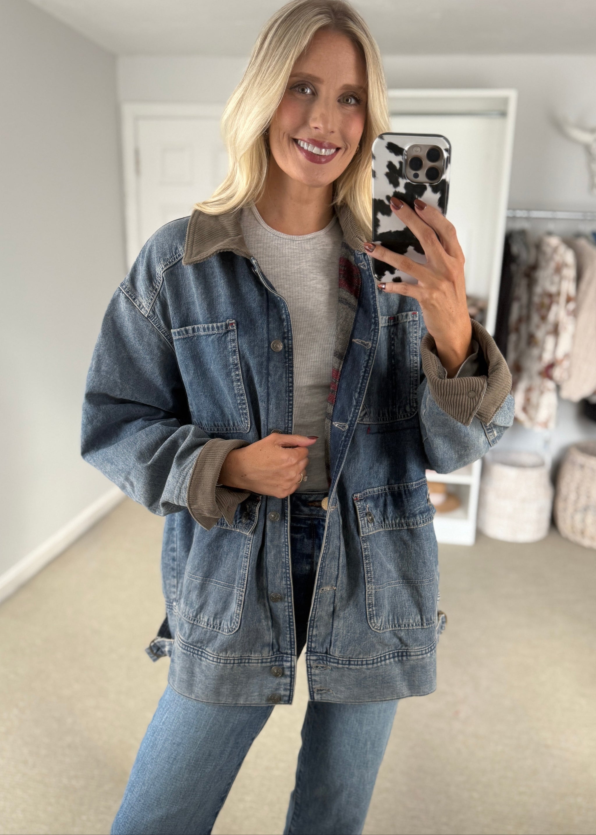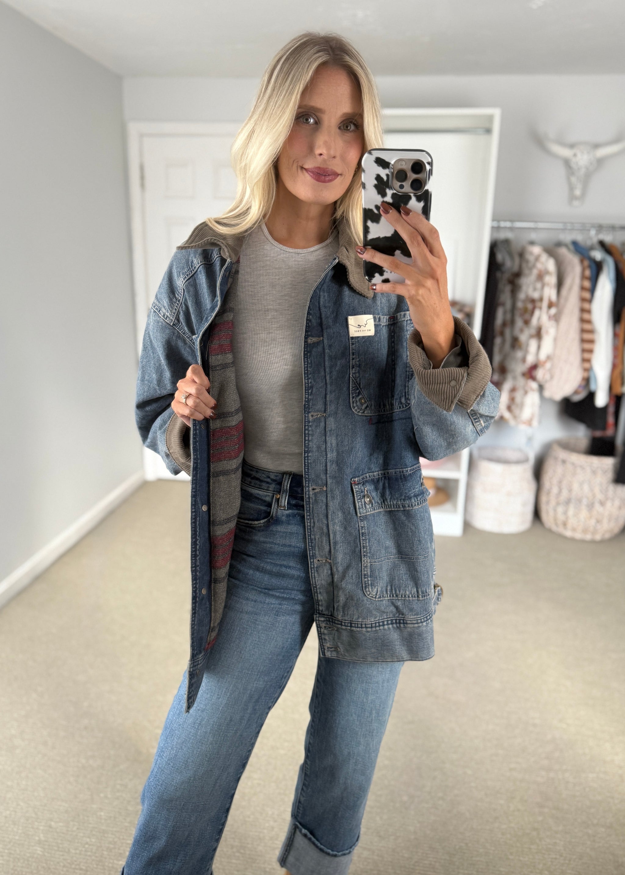 The rustic country vibes are strong with this classic barn coat from We The Free, constructed in a denim fabrication and a slightly longline, oversized...