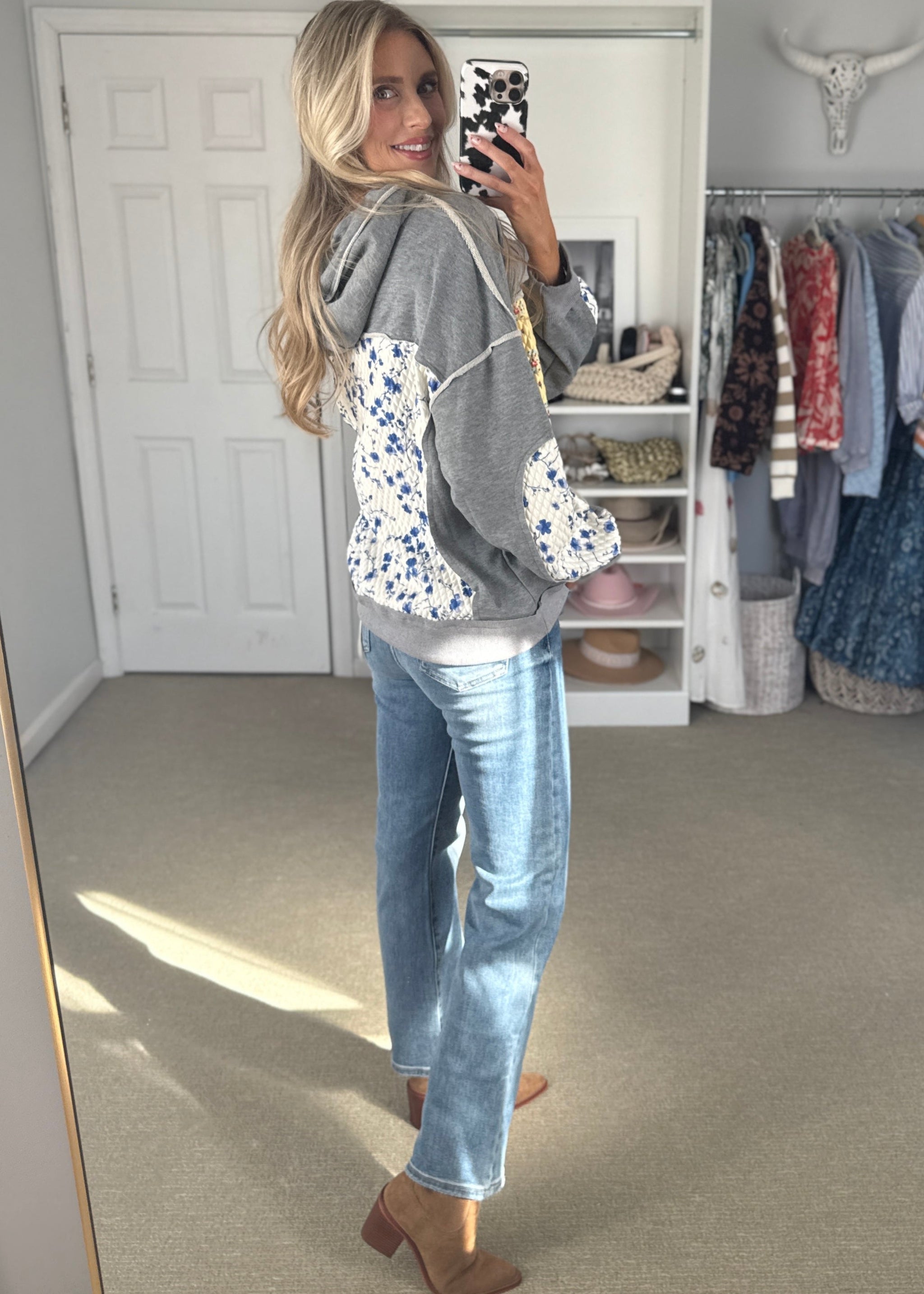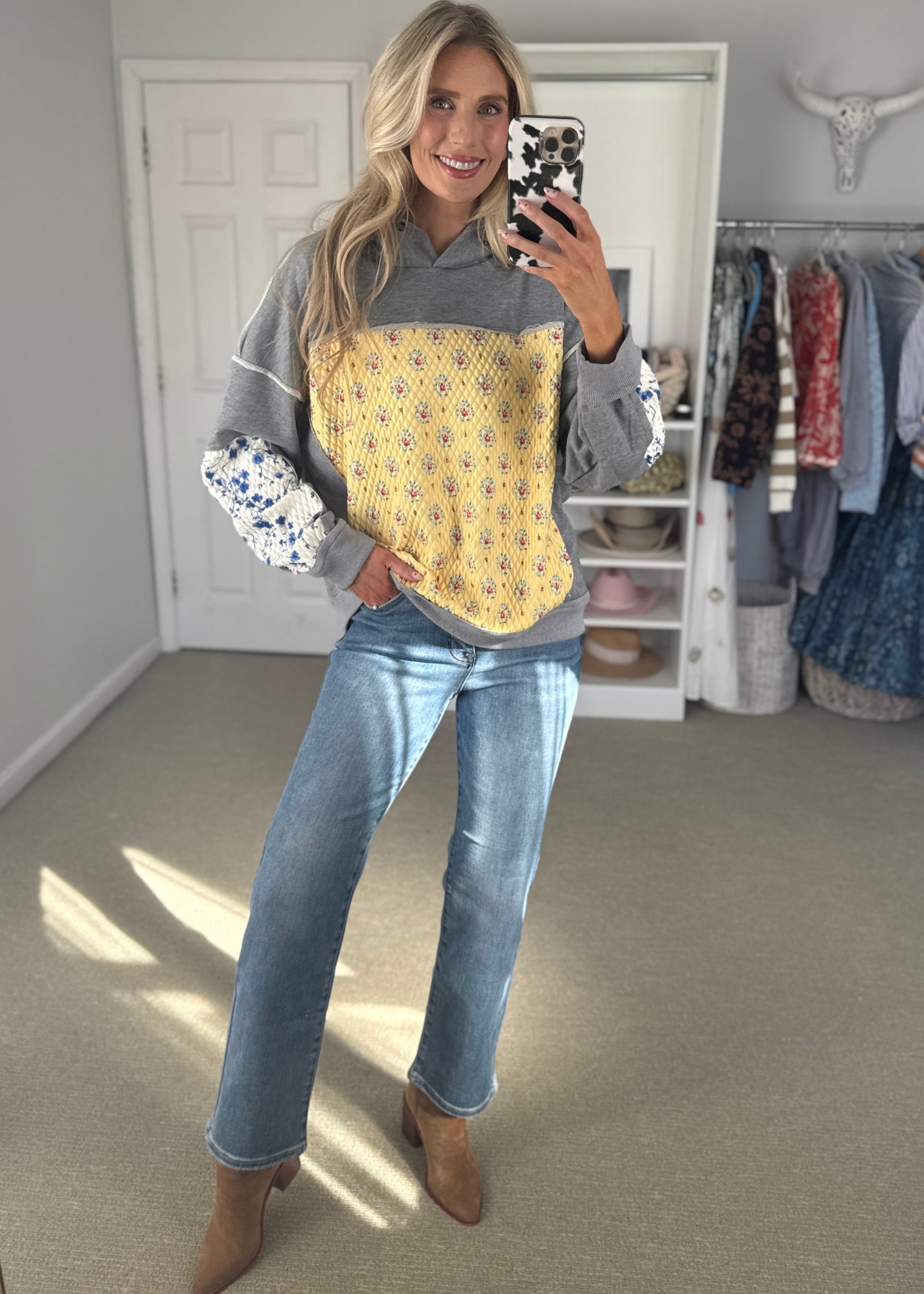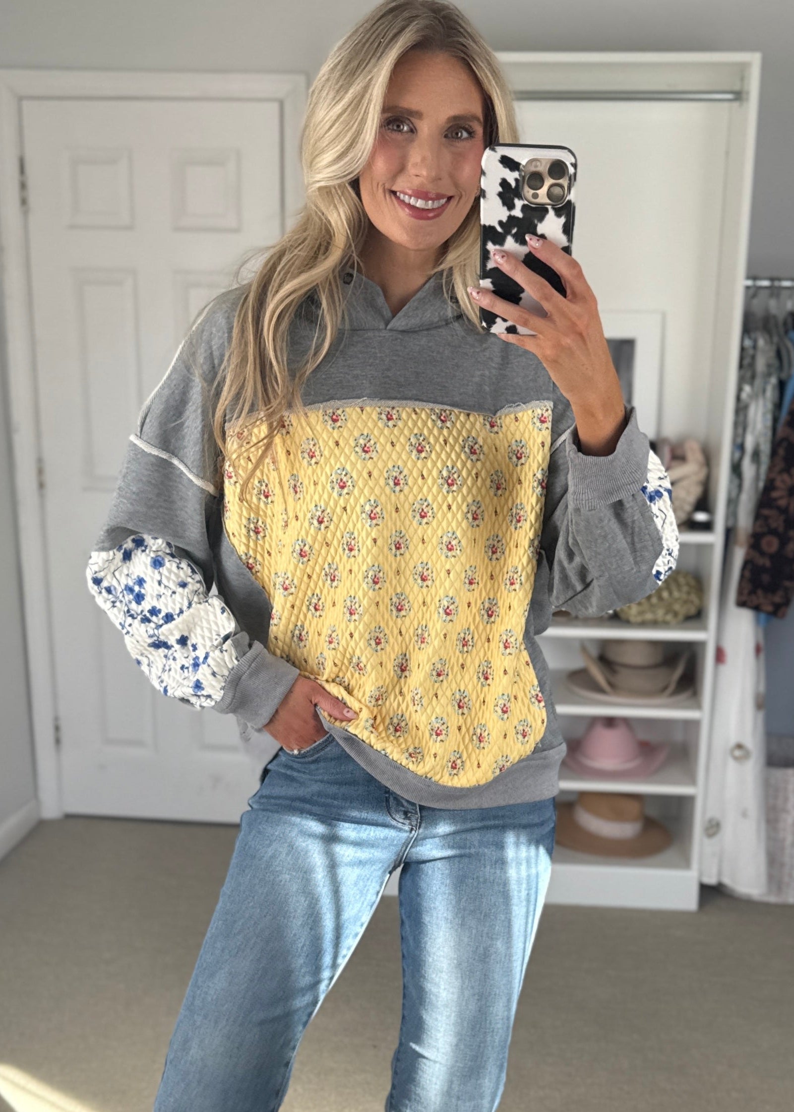 This quilted patchwork hoodie blends cozy comfort with vintage-inspired charm. Designed with a soft heather gray base, it features a quilted yellow floral panel across...
