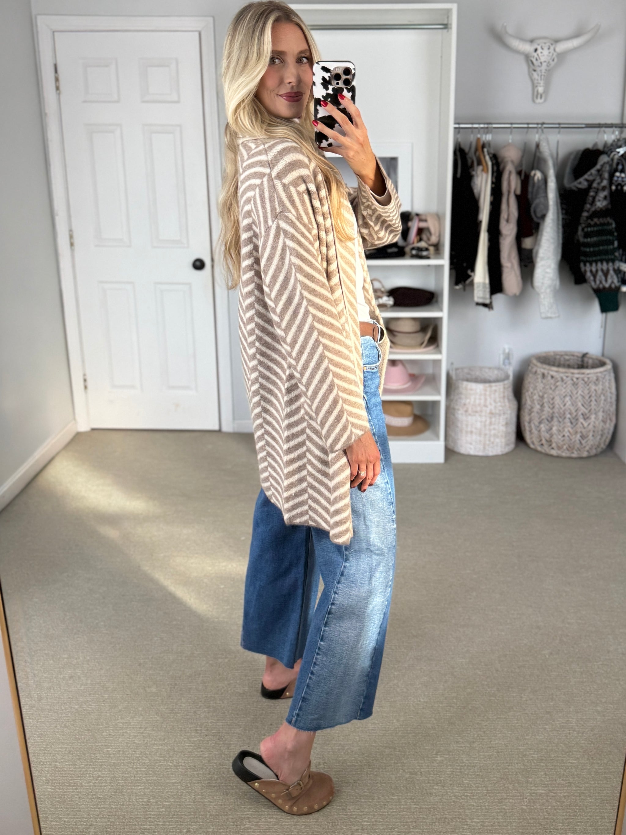 zip front caridgan sweater in oatmeal. Oversized and slouchy fit.