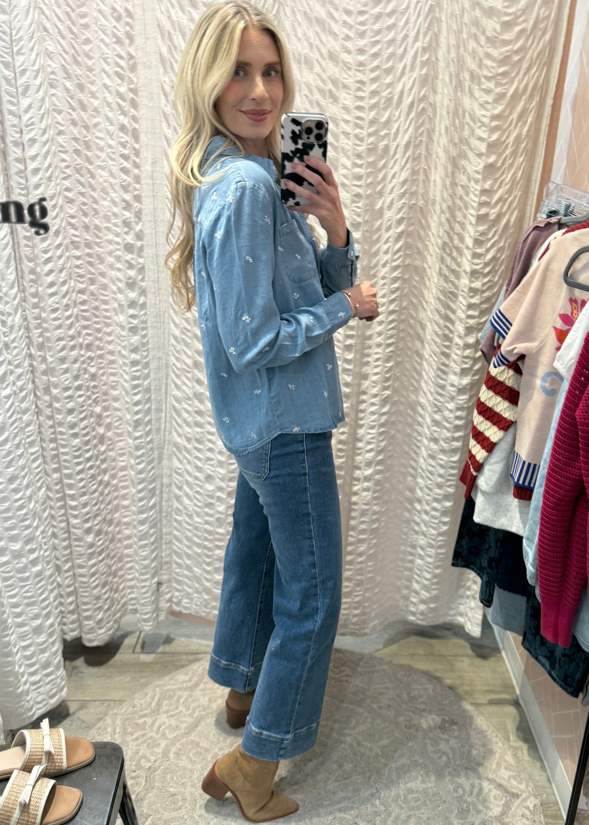 A light blue tone-on-tone floral pattern makes for a very pretty and unique denim shirt. Wear it alone or over a tank for a layered...