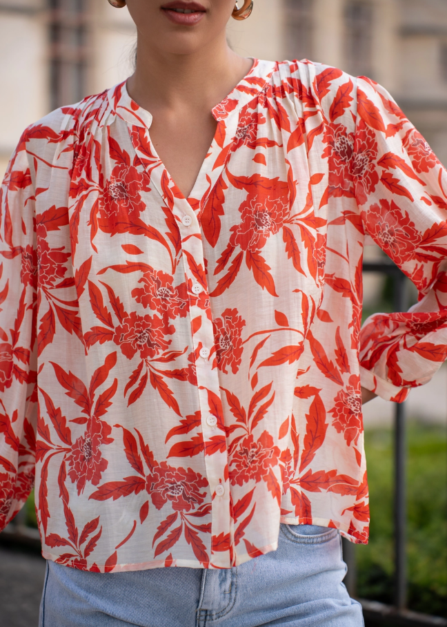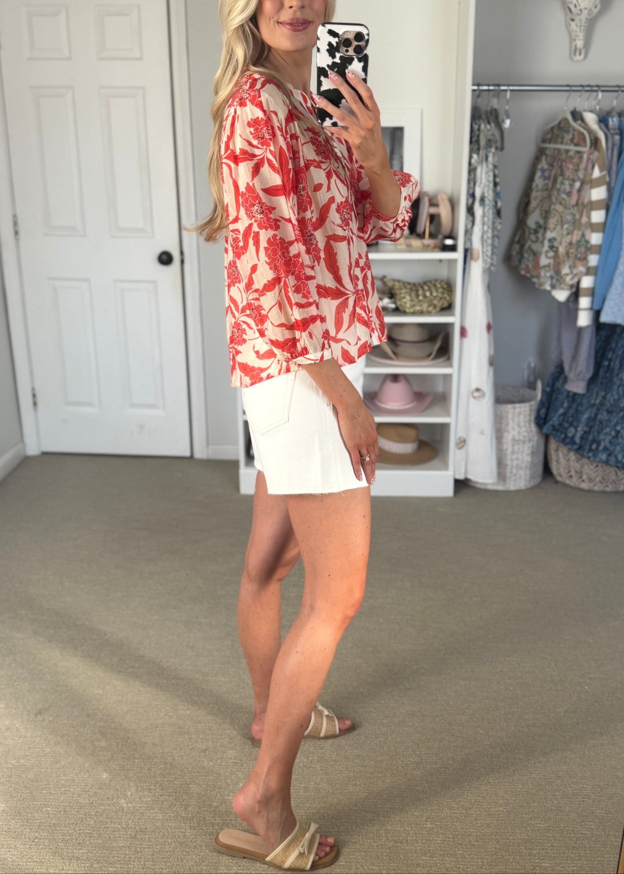 Light and airy, this slightly sheer blouse is done in a beautiful rosy red and white floral. With three-quarter sleeves, button-front and V-neck, this is...