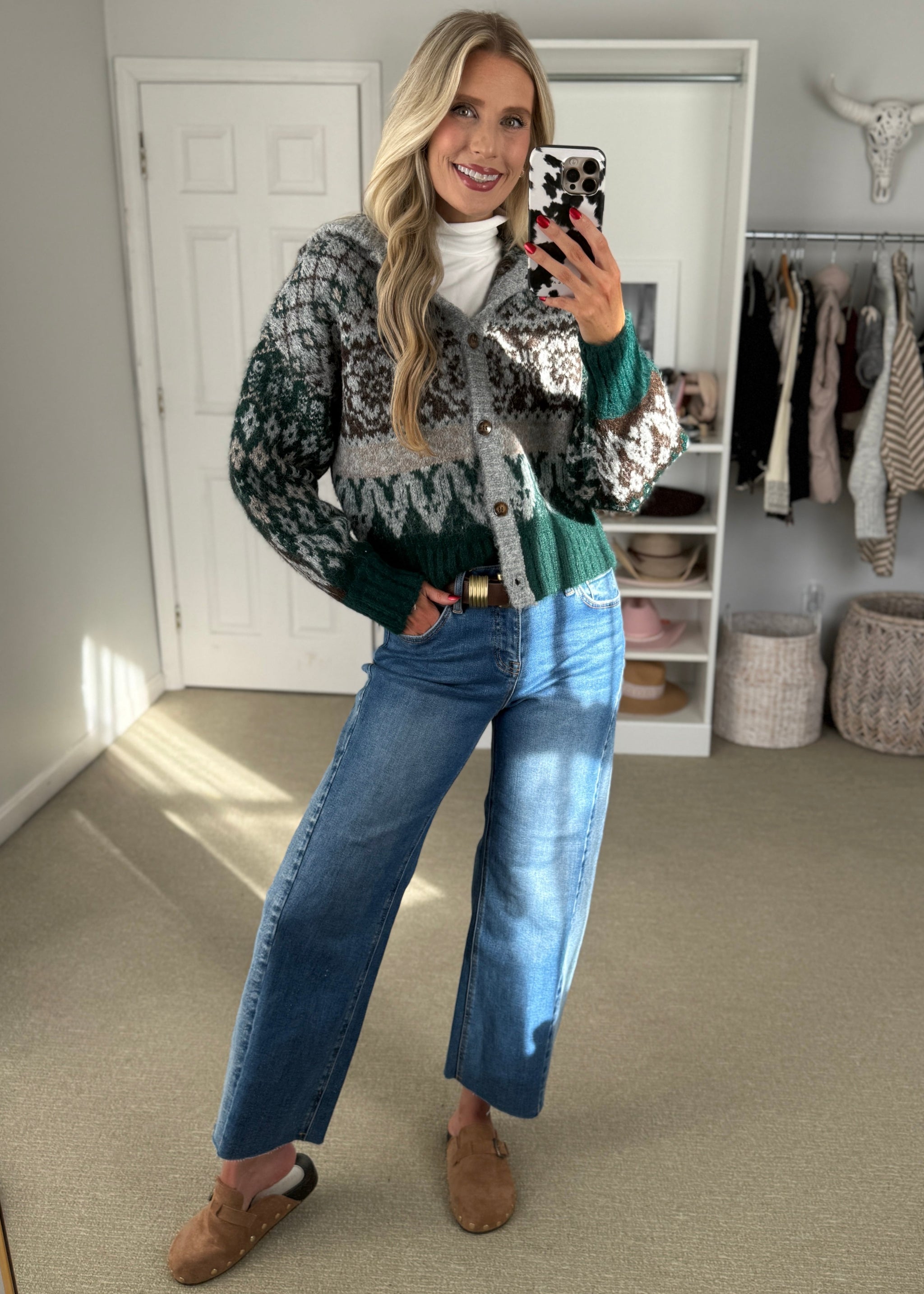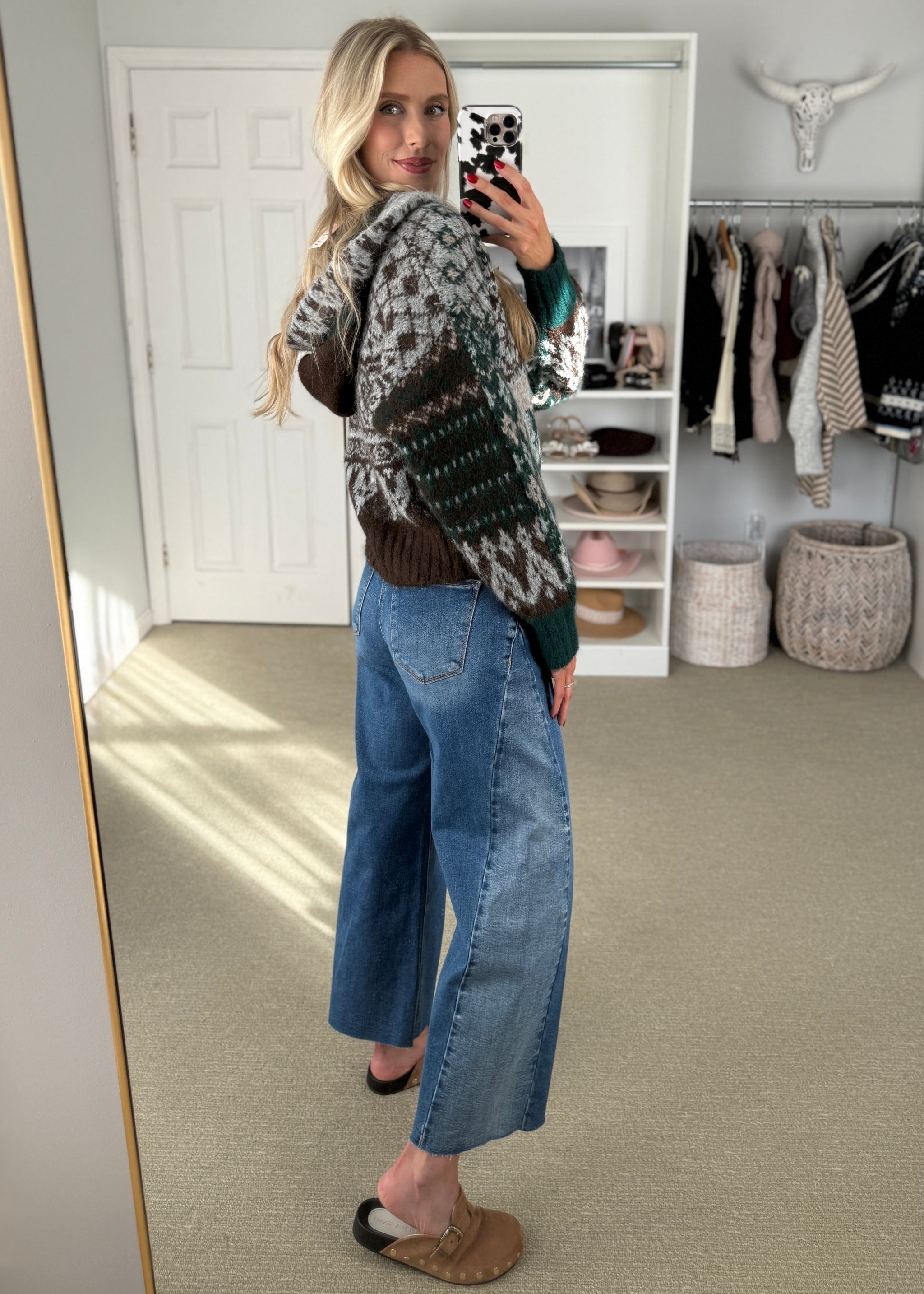 This cozy and stylish hooded cardigan sweater is perfect for layering. showcasing a distinctive Nordic-inspired pattern meticulously woven throughout its design, further enhanced by a...