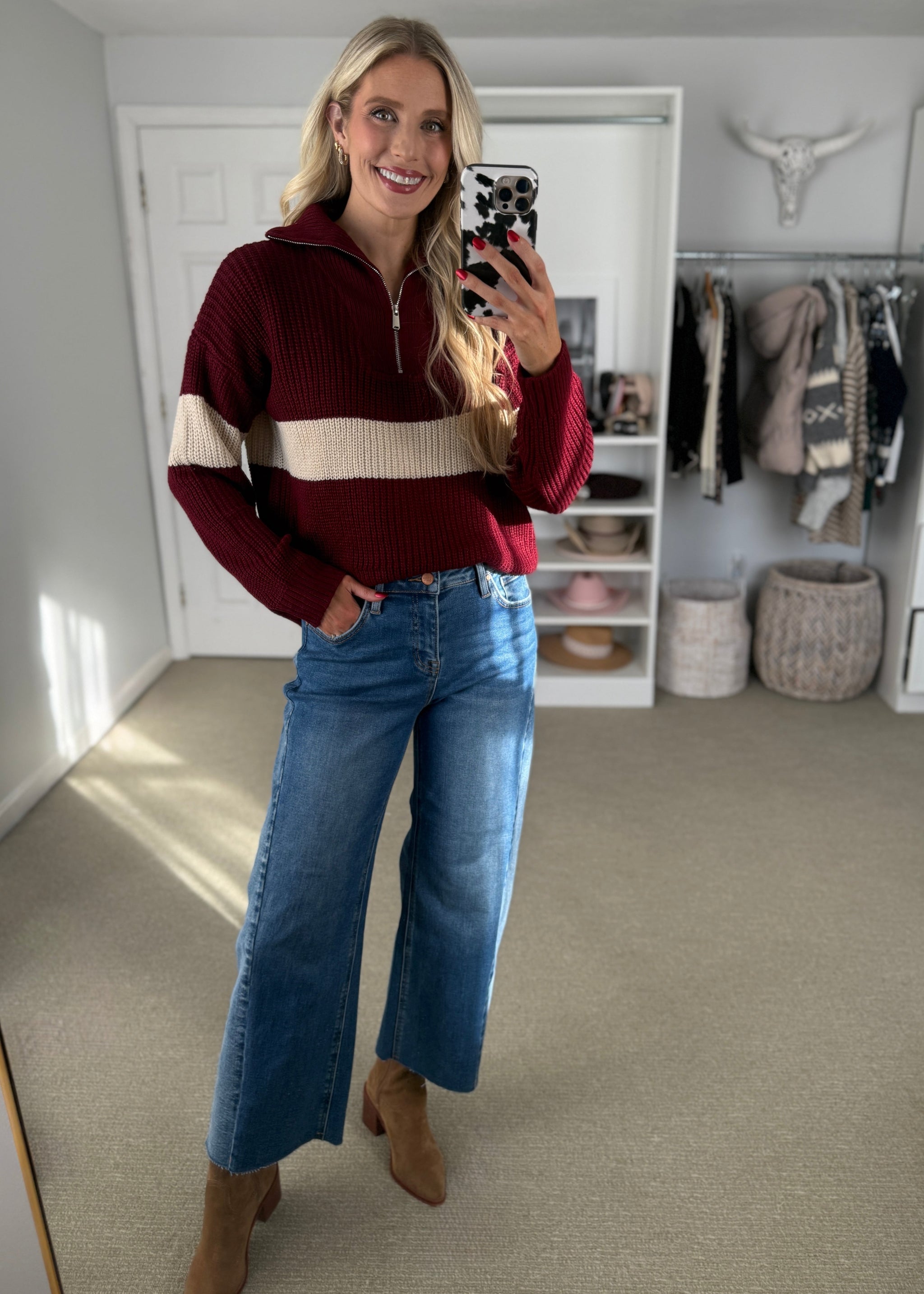 burgundy quarter zip sweater with collar and beige stripe detail.