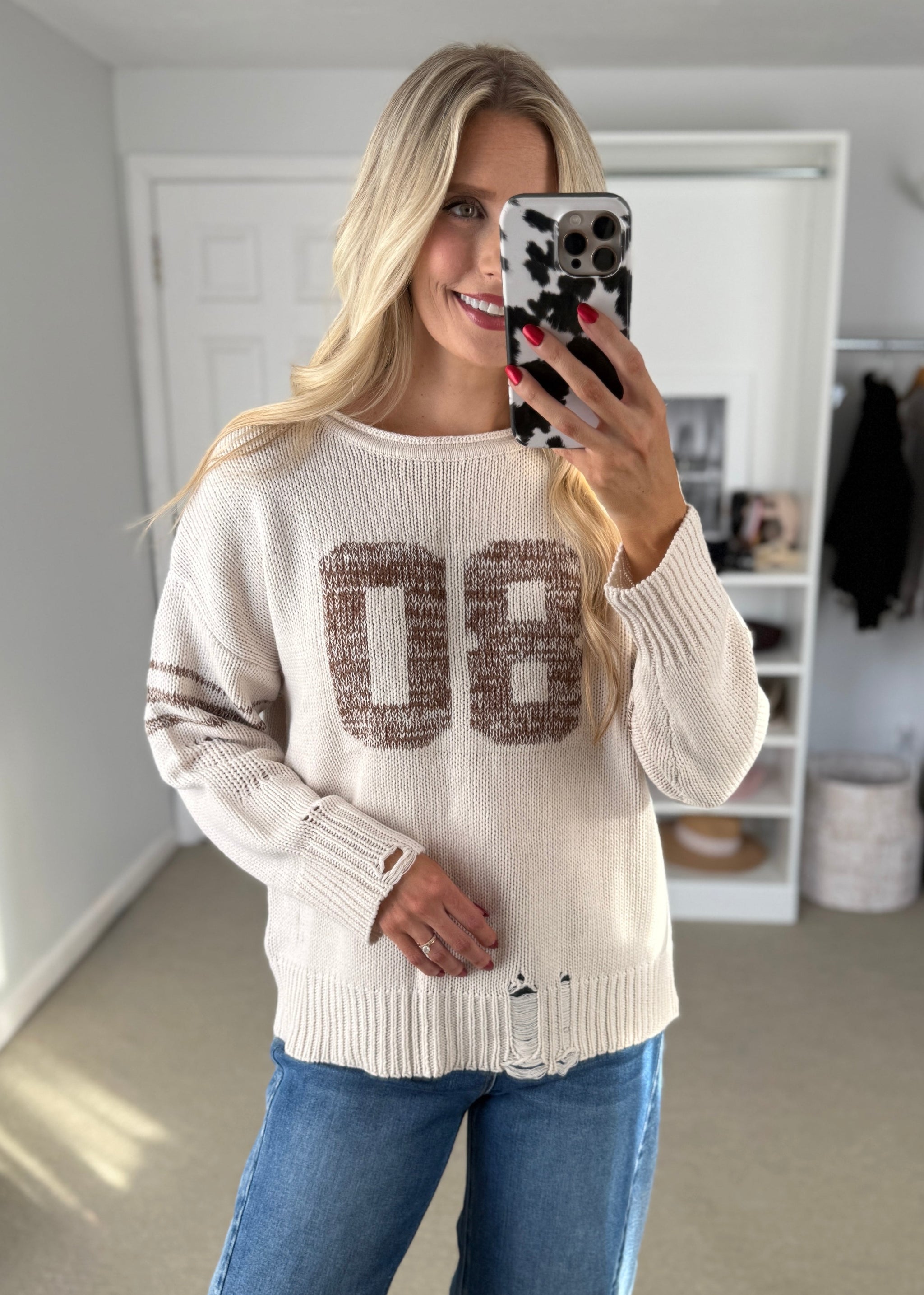 Long sleeves Stripe sleeve sweater with distressing. Varsity Number pattern. Relaxed fit Knit pullover 60%cotton, 40%acrylic