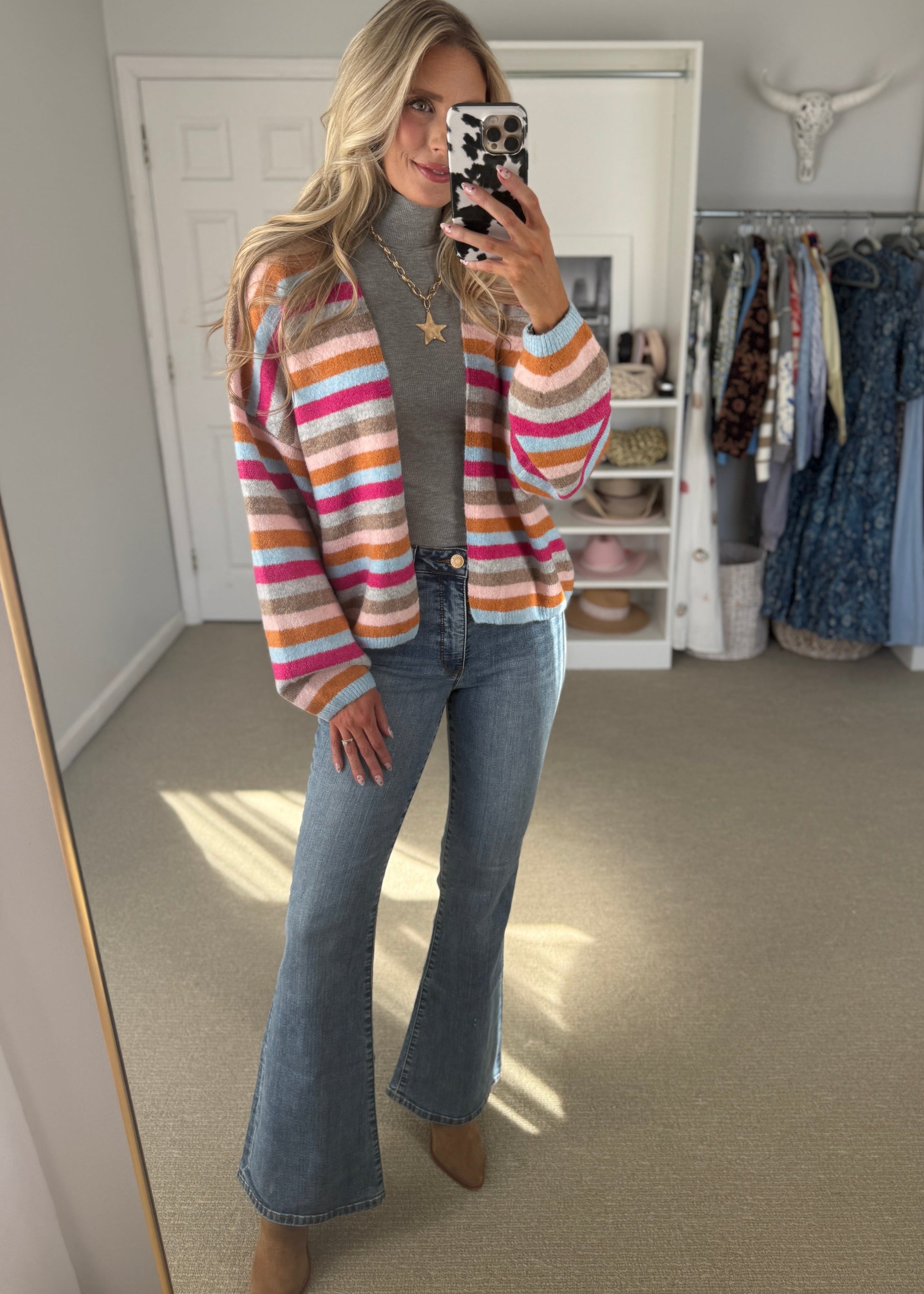 a STRIPED rainbow of colors adorn this buttonless CARDIGAN. With a casual, relaxed fit it's a great topper for a basic outfit and will instantly...