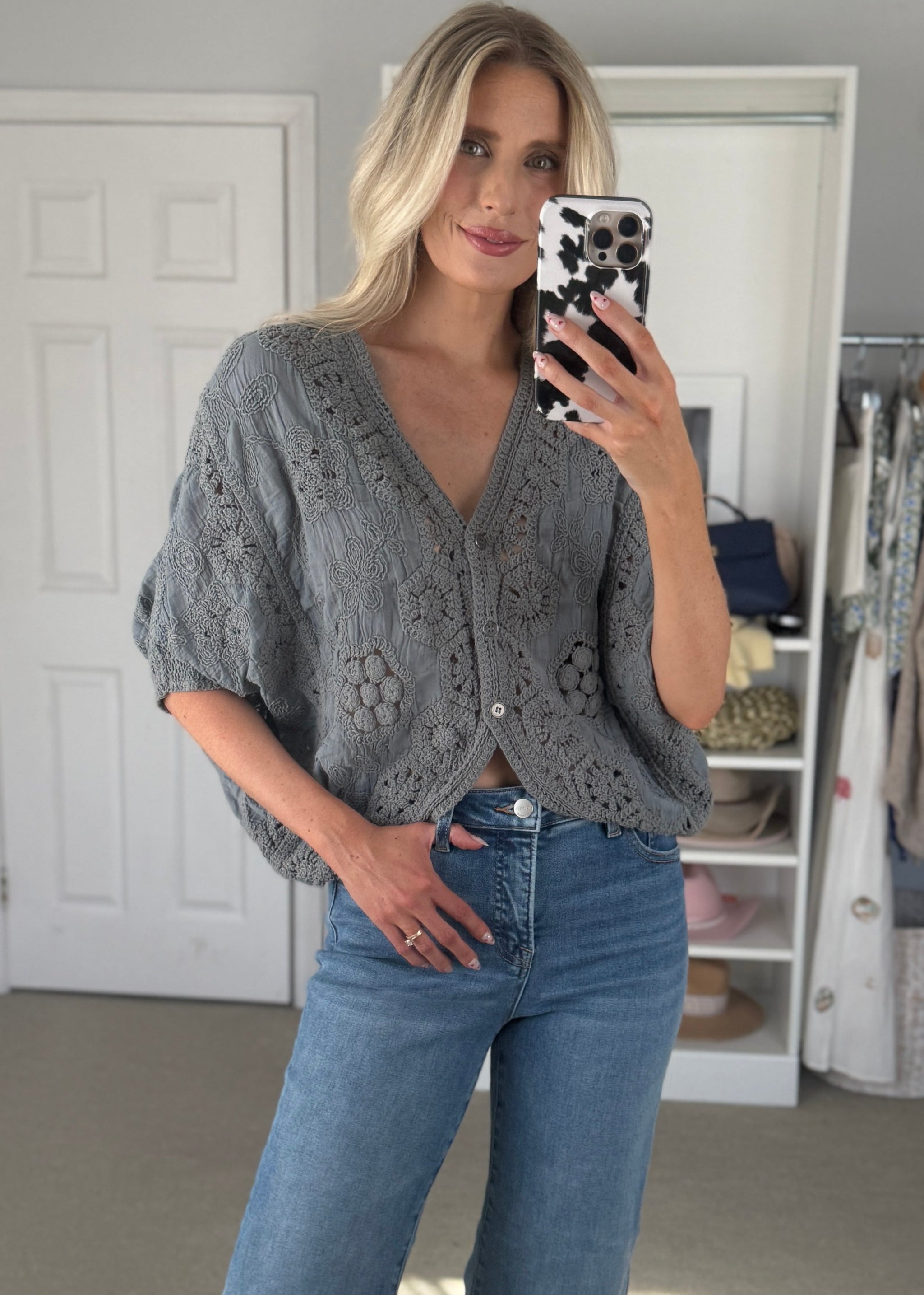 Designed with a V-neck and roomy fit, this button-front cardigan in crochet is a stunning must have. Available in natural or grey, it's a one-size...