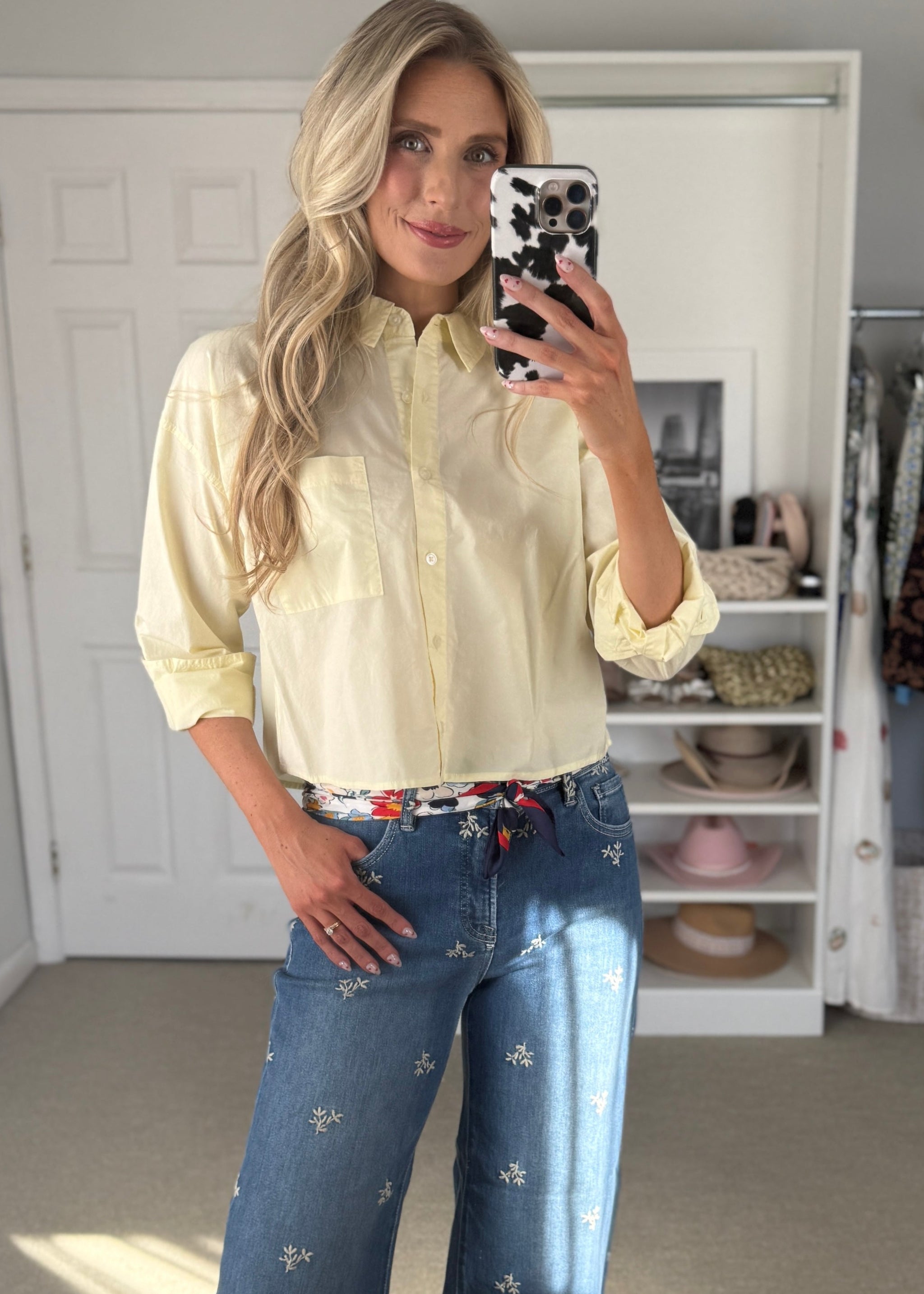 a classic 100% Cotton poplin shirt in a cropped fit gives this blouse a modern twist on the classic button down. True to size.