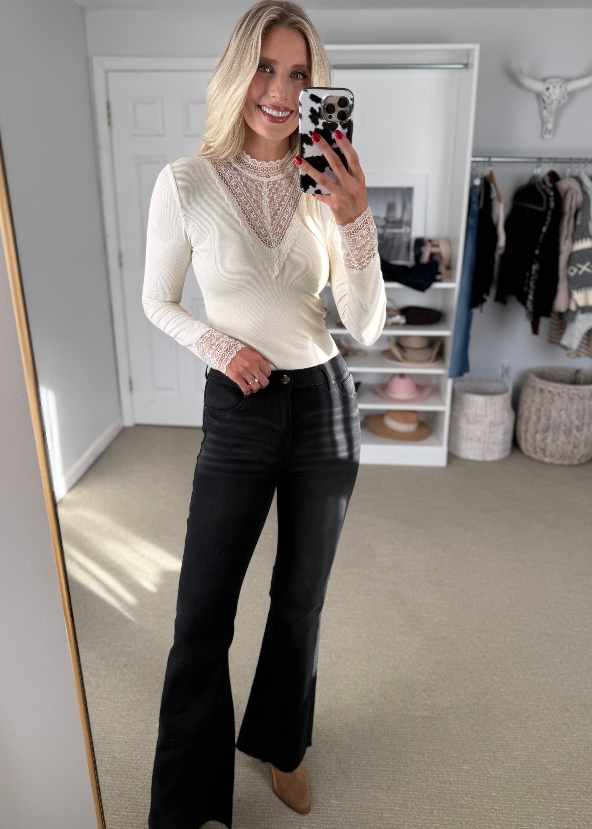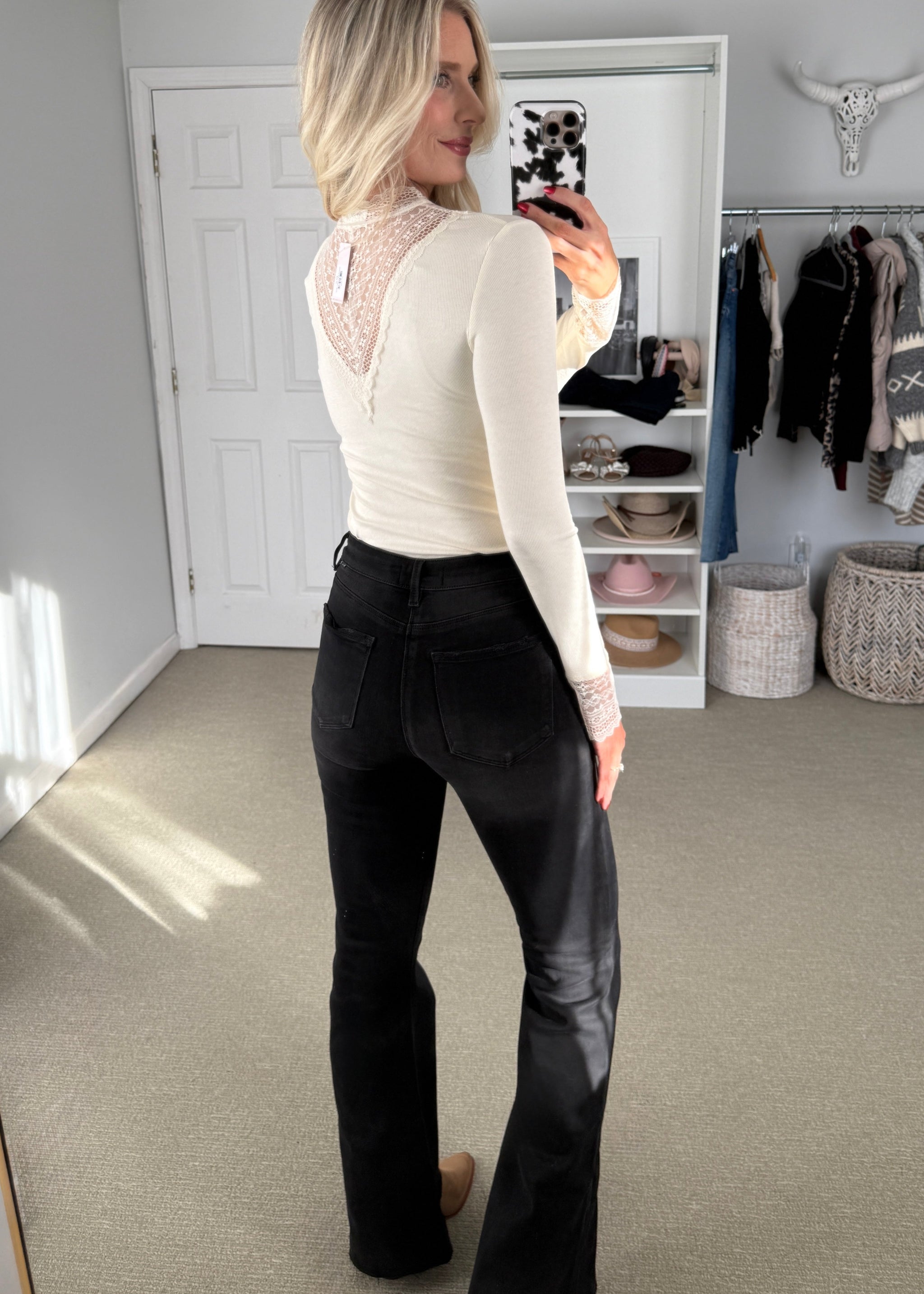 A sweet and feminine top trimmed in lace with a full button front. With a wide v-neck, it's an ultra lightweight ribbed knit. Poly/viscose/elastane. True...