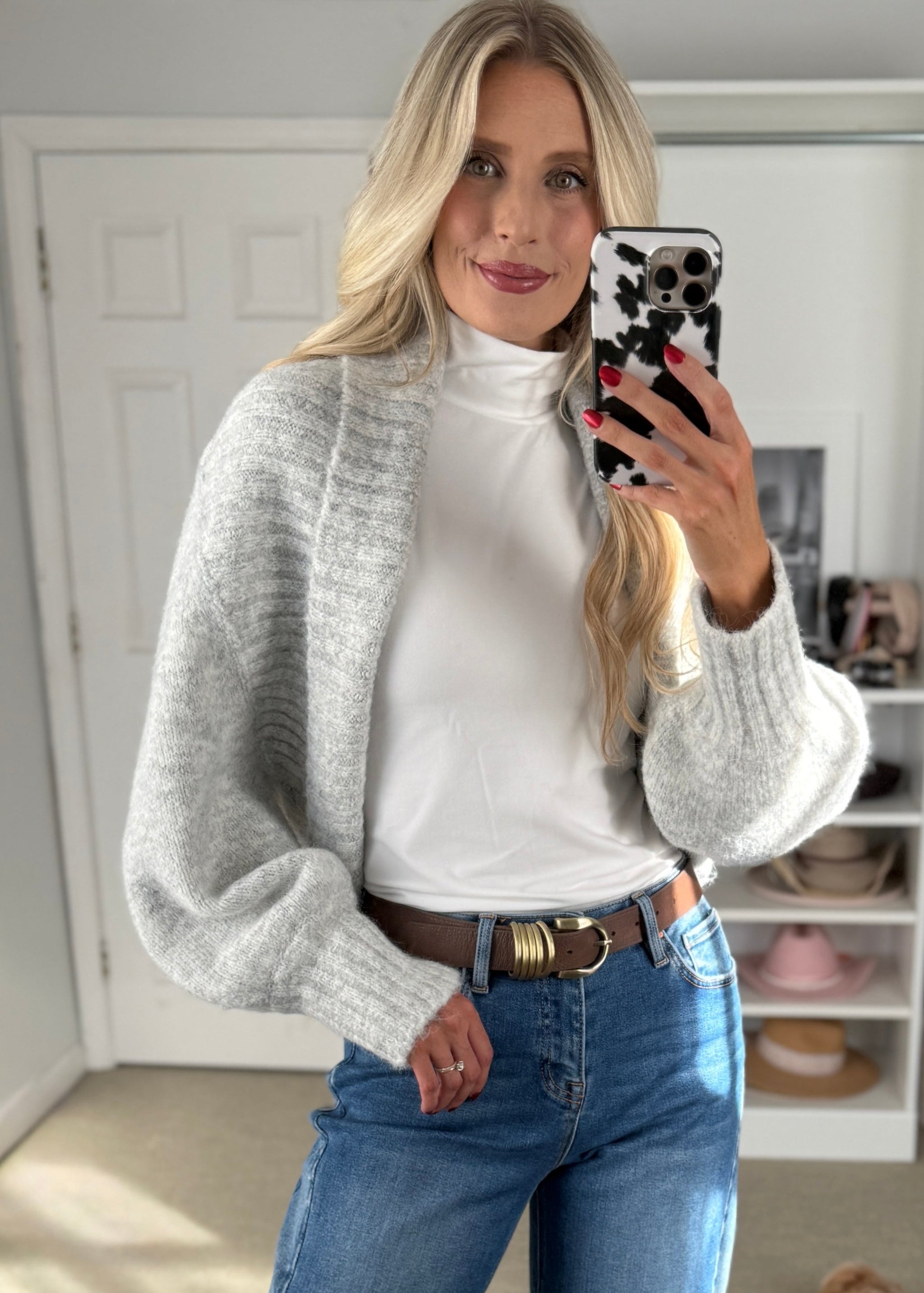 This stylish cropped chunky, open shrug is so fun and warm. The garment has a relaxed and draped design, gracefully covering the arms and shoulders,...
