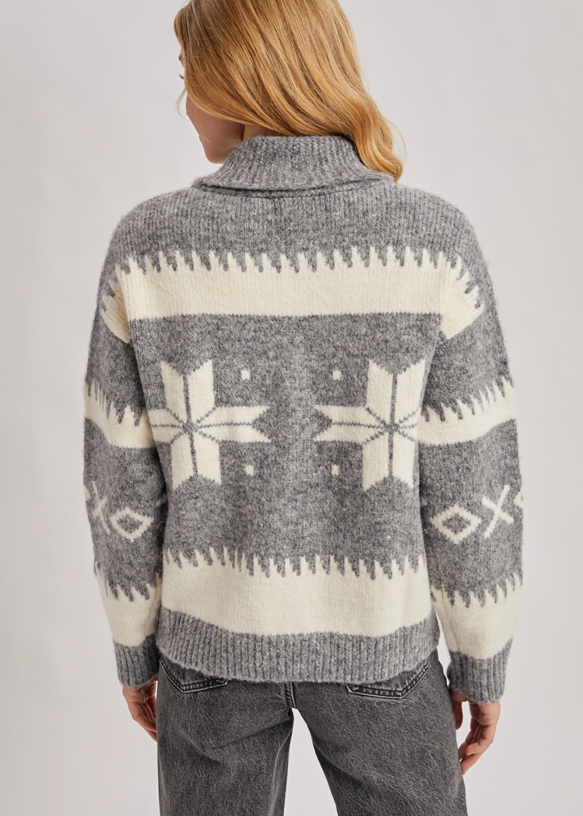 Knit cardigan with a full-zip front, which has a collar and two front pockets. This piece features a distinctive fair isle pattern with large white...