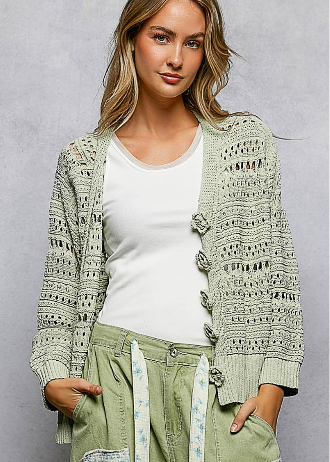 A soft, open-knit cardigan designed for effortless layering. It features uniquely handcrafted 3D floral buttons that serve as the key focal point. The silhouette is...