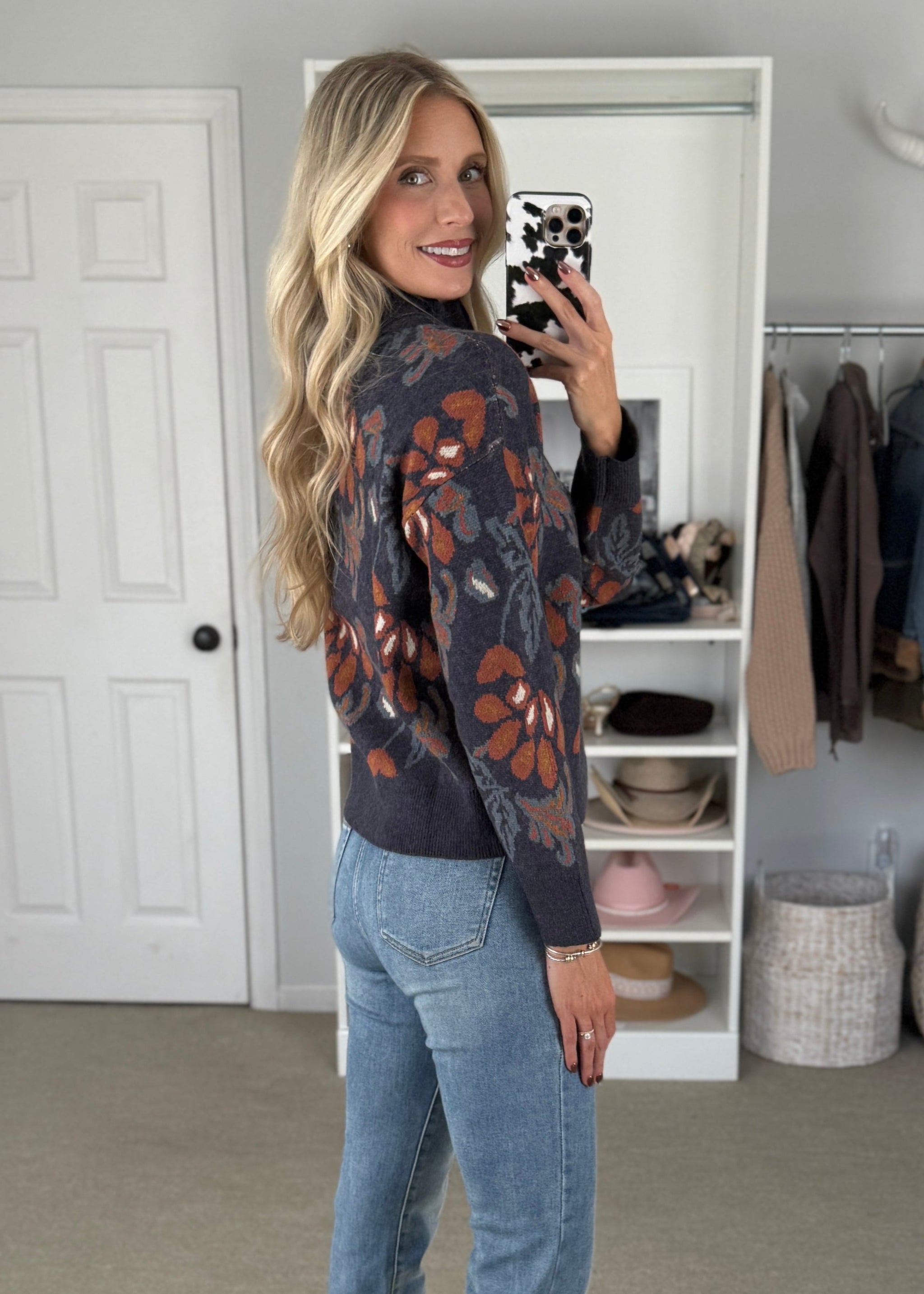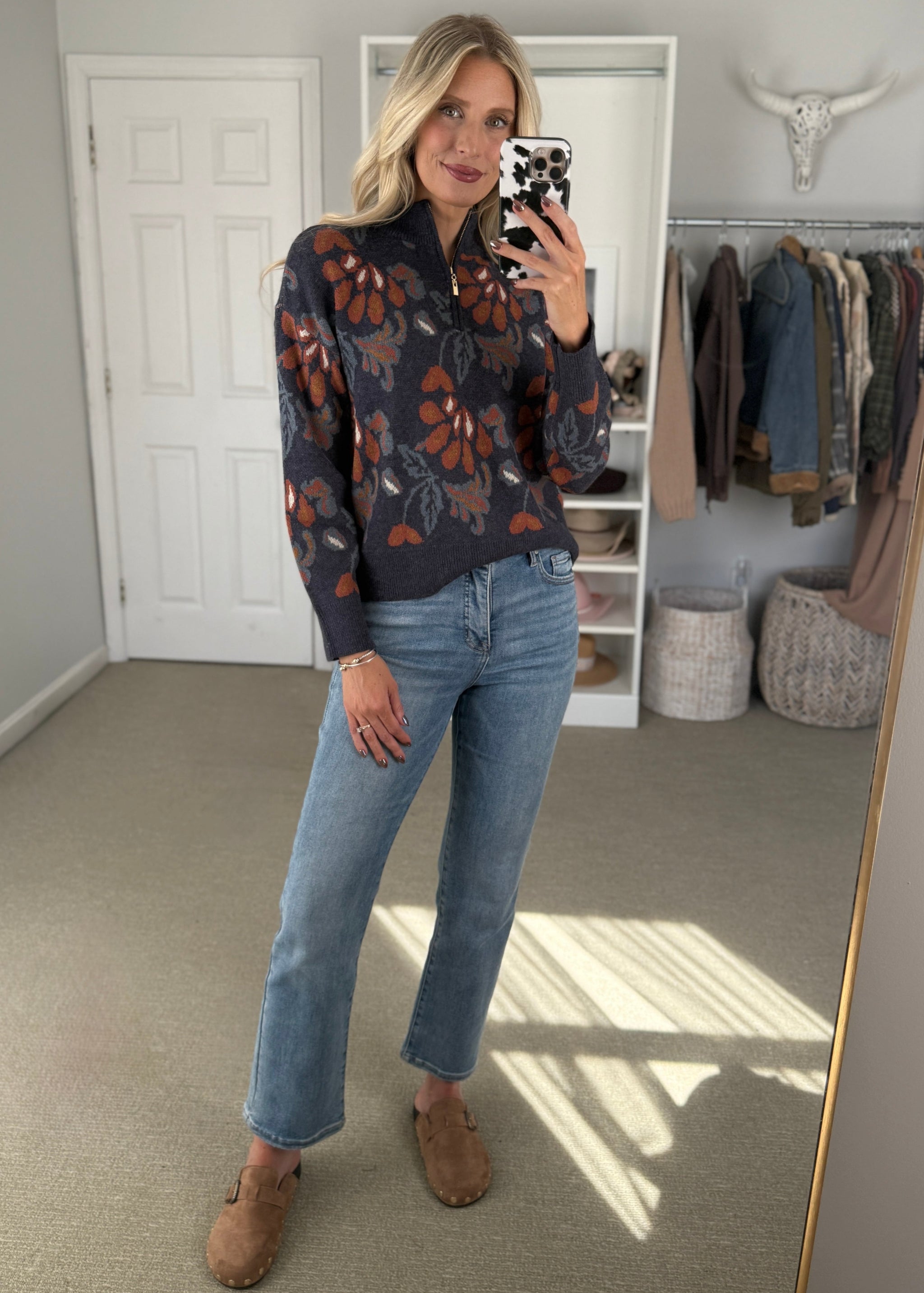 Pattern Jacquard Half Zip Up Sweater.  True to size.  50% Acrylic 31% Polyester 19% Nylon
