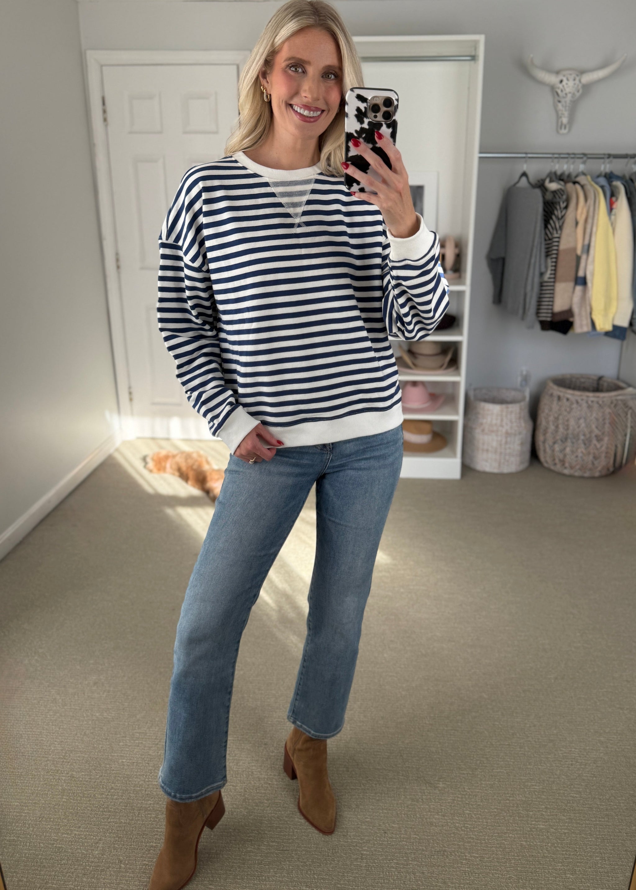 pink, cream & red stripe sweater with 1/2 zip detail. Cropped length
