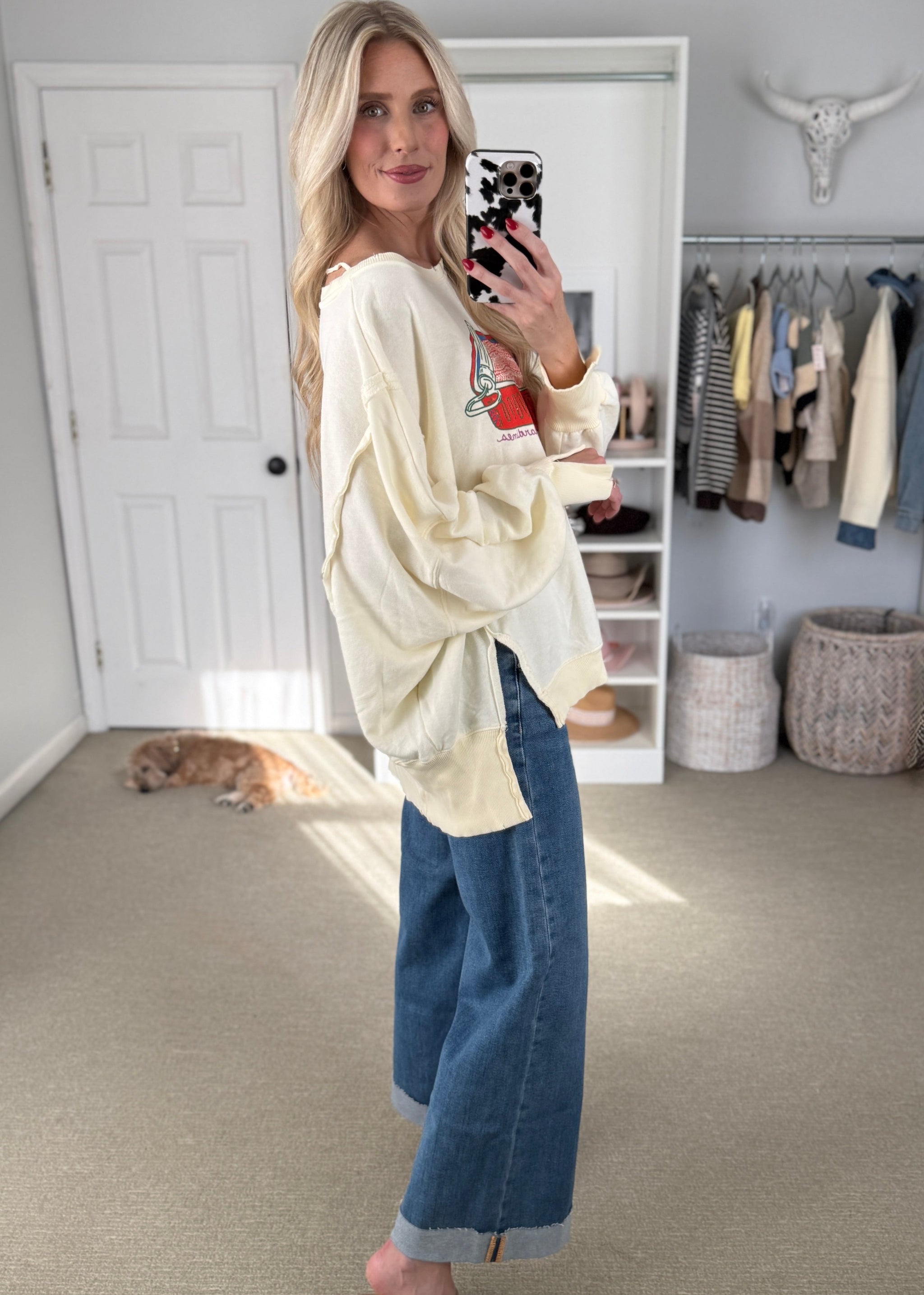 This oversized and distressed sweatshirt, features the trending Sardine image printed on a creamy background. Cotton/poly.