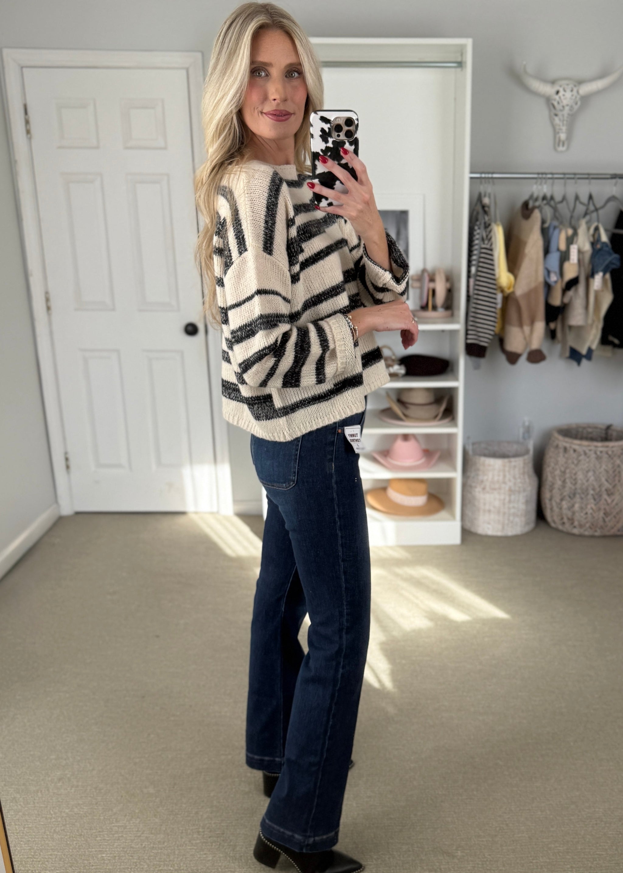 A wide, color block striped sweater in sage and cream with navy trim. 80% ACRYLIC 20% NYLON.