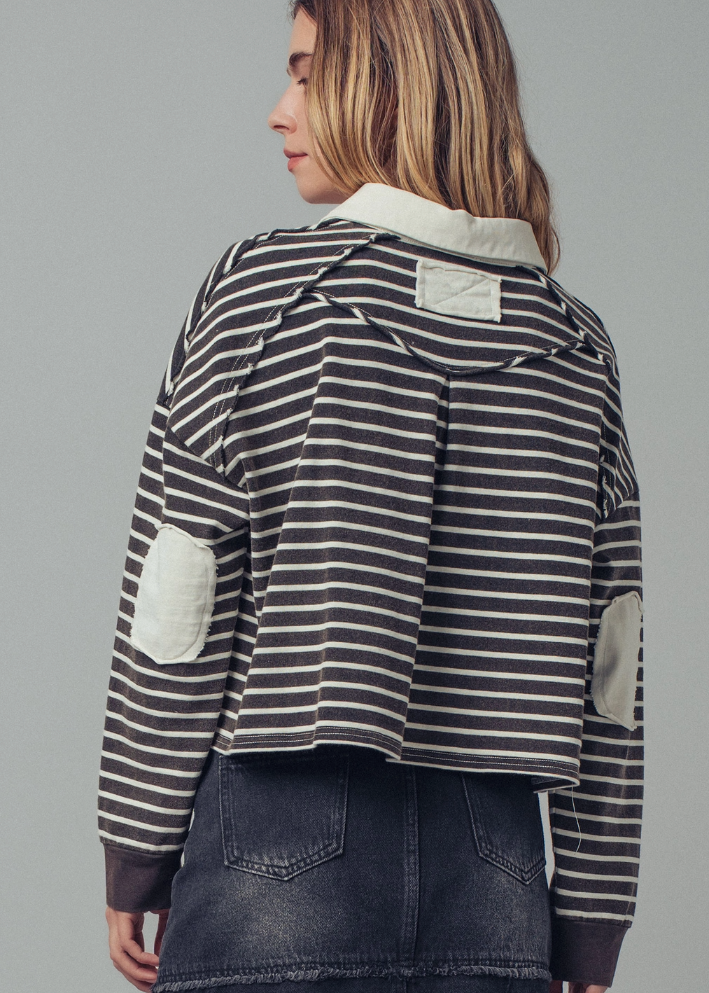 Add a pop of personality to your spring 2025 clothing edit with this cropped striped top featuring contrast elbow patches and a polished collar. Its...