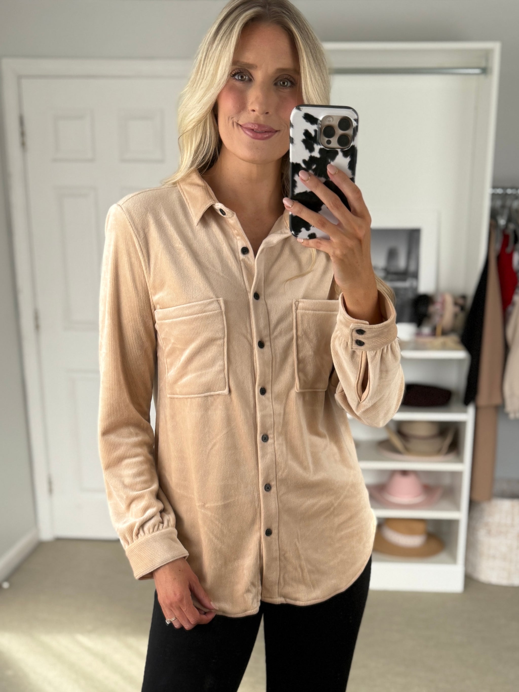 A cross between the softest micro corduroy and a light-weight plush velvet. This button up shirt can be worn on its' own or layered as a shacket. The Blankie has a slightly finer ribbing than the Teddi. A fan favorite at Wish, these never last long. True to size. Also available in pink. Poly/spandex. Poly/spandex. Also available in ruby.