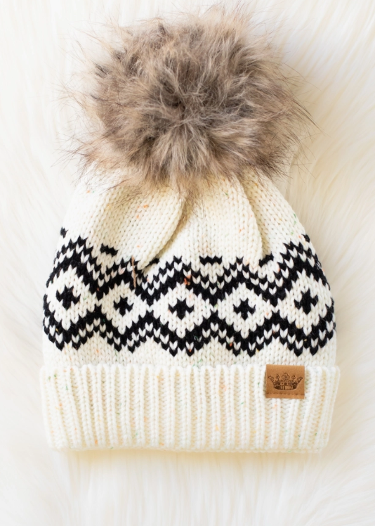 Adorable and warm, this black and cream patterned beanie is fleece lined and will fit most women. it pairs perfectly with the Bunny Hill mittens. 100% Acrylic; also available in cream and red.